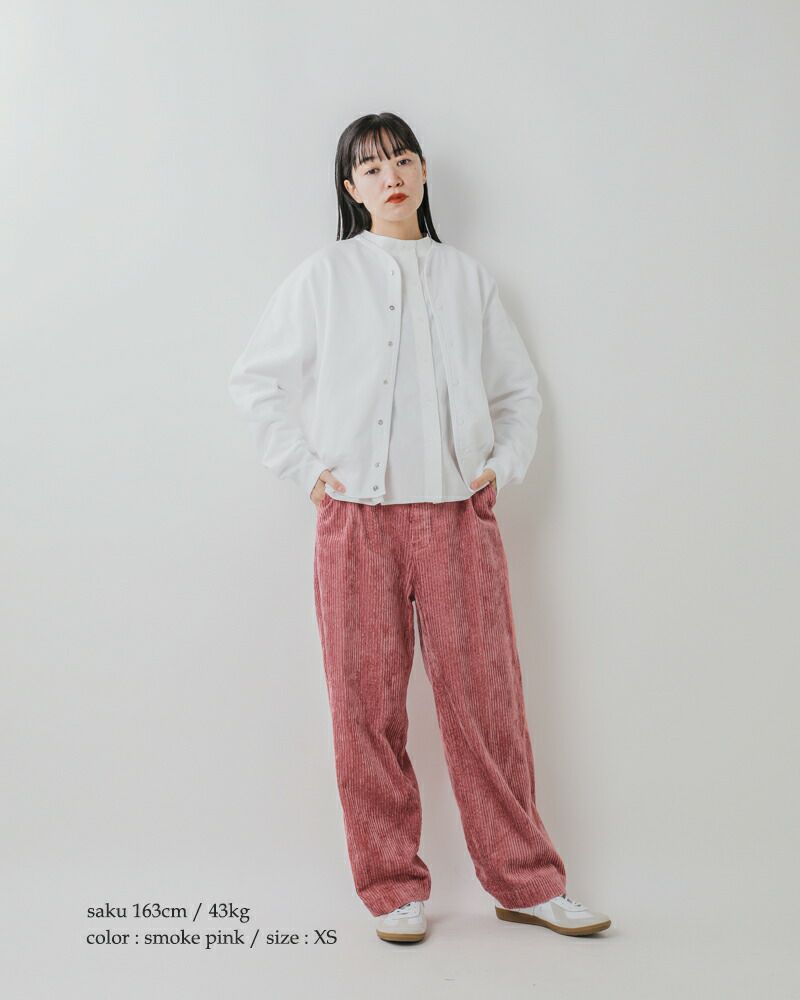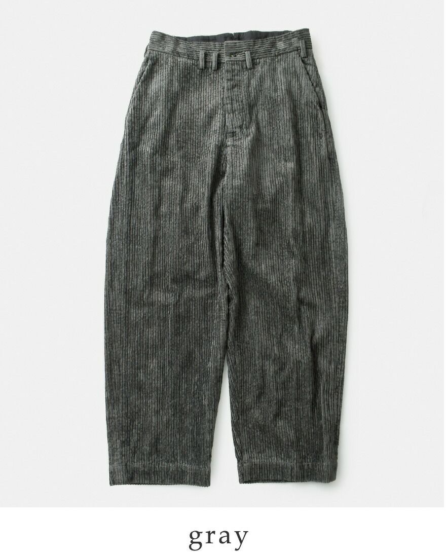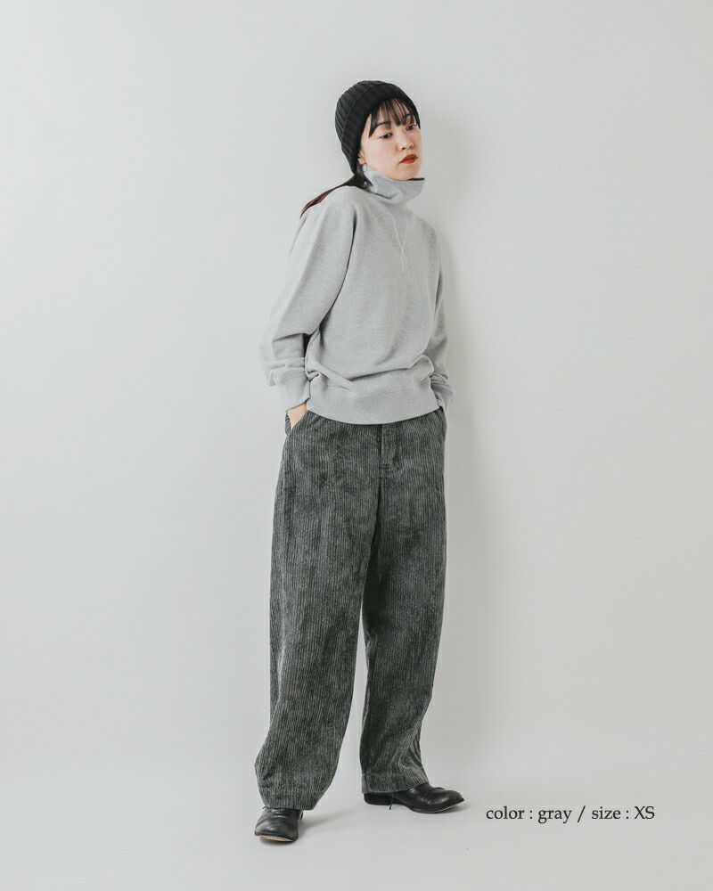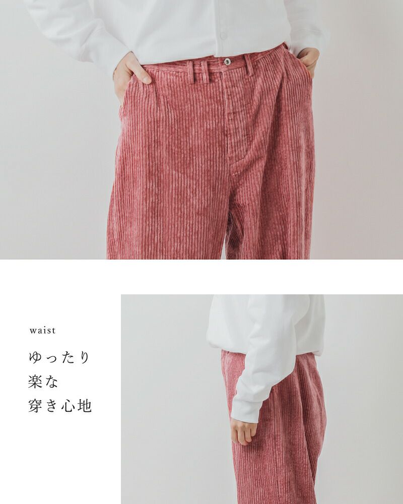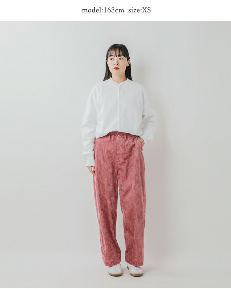 股上が深く、腰周りがゆったりとしたワイドストレートシルエットです。コーデュロイが膨張して見えず、すっきりとした形に仕上がっています。
