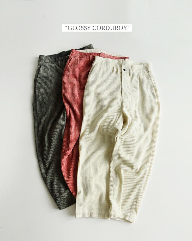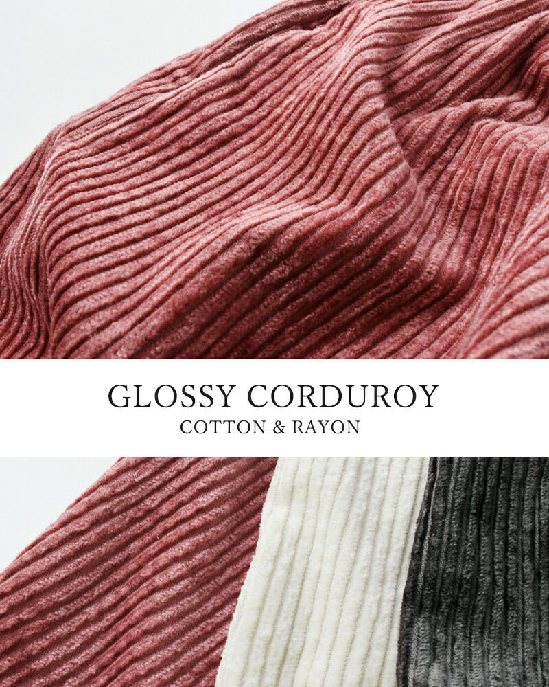 コットン58% レーヨン42% 太畝の部分が光沢のあるレーヨン糸を使用した艶のあるコーデュロイ生地です。製品洗い後タンブラー乾燥させていますので生地自体に膨らみが出てムラ感があり、味わい深い風合いに仕上がっています。柔らかくふっくらとした厚手の生地で、秋冬に暖かく穿いていただけます。