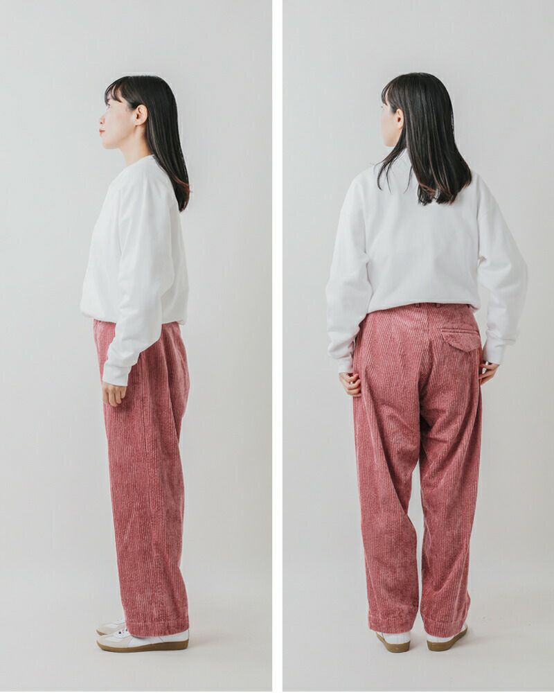 すとんと落ちたシルエットで、洗練されていて、ほっこりしないコーデュロイパンツに仕上がっています。ヒップ右側にバックポケットを配置し、タックインもきれいに見えます。
