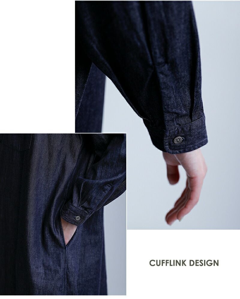 フロントに貝ボタンをあしらった、上質感のあるレギュラーカラーのロングシャツワンピース。素材にはインディゴダンガリーを使用し、デニムライクな表情を持ちながらも、春夏でもさらりと快適に着用いただける軽やかな着心地に仕上げました。