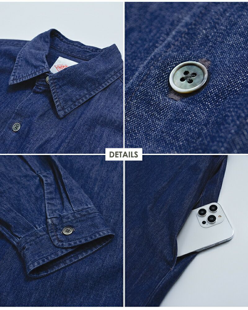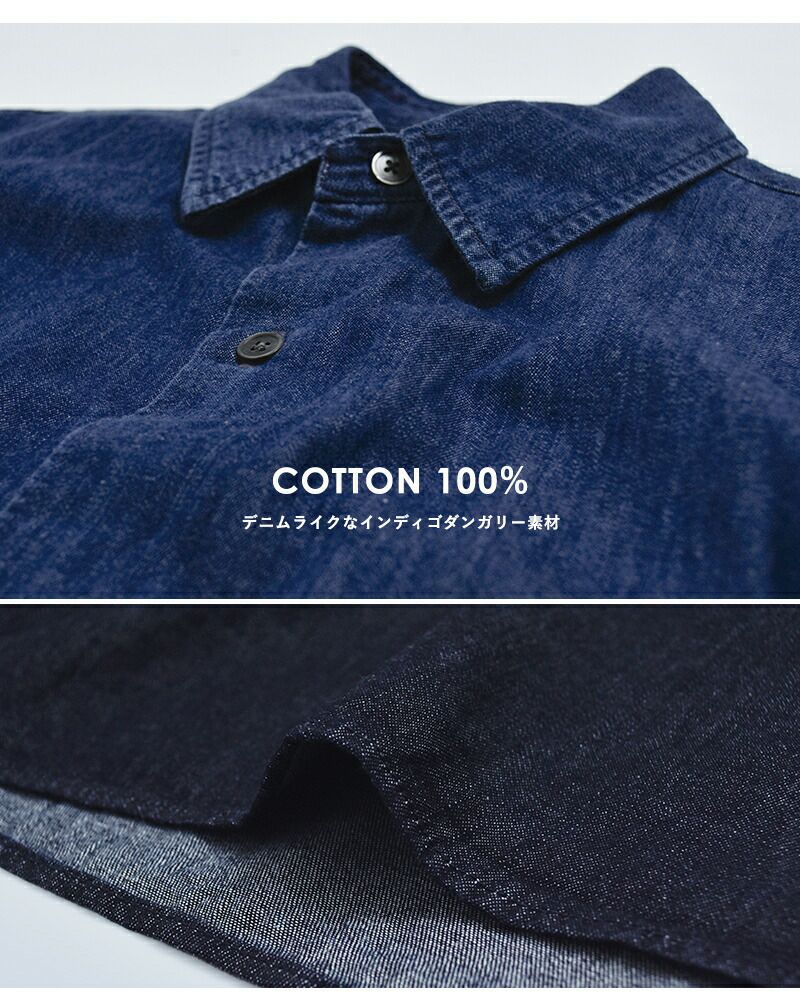 首元はベーシックなレギュラーカラー仕様。インディゴダンガリーのラフな風合いに、きちんと感を添えることで、上品さとカジュアルさを兼ね備えた印象に仕上げています。
