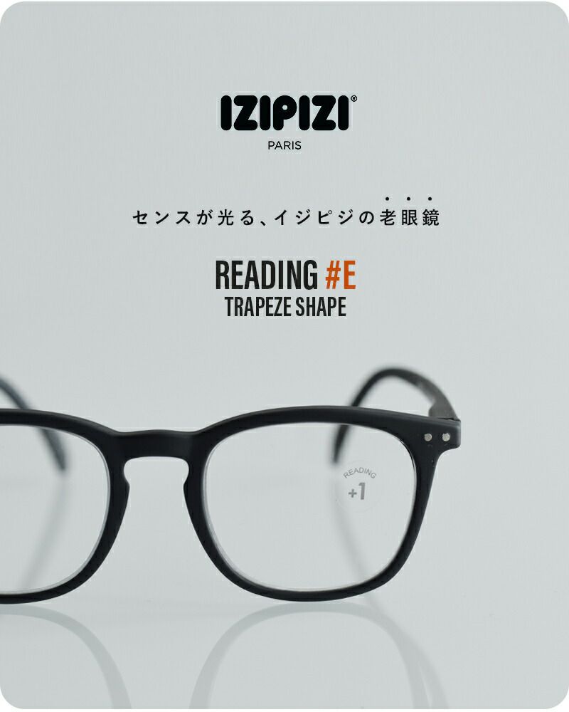 IZIPIZI(イジピジ)より、度付きトラピーズシェイプリーディンググラス「e-reading」のご紹介です。程よい丸みのスクエアベースのフレームなので、女性でも使いやすくなっています。誰しも歳をとれば訪れる老眼、見えにくくても我慢せずおしゃれに快適に読書をお楽しみいただけます。とても軽いので疲れにくく、おしゃれなデザインがコーディネイトのアクセントになってくれます。