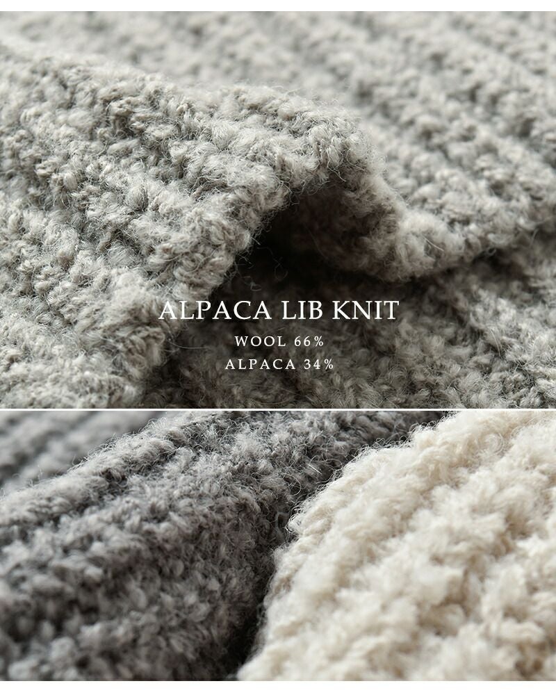 ウール素材とベビーアルパカを合わせた、ふんわりとしたリブニット。大き目の編み地は空気を含むように柔らかく、軽やかであたたかな着心地です。