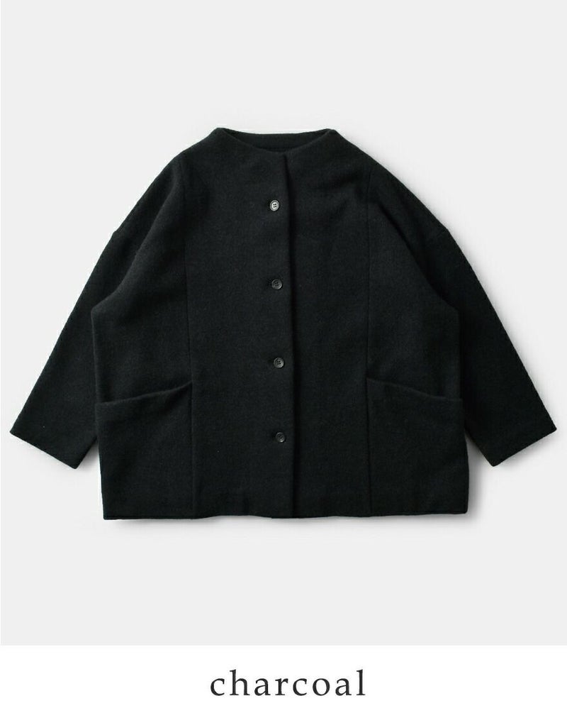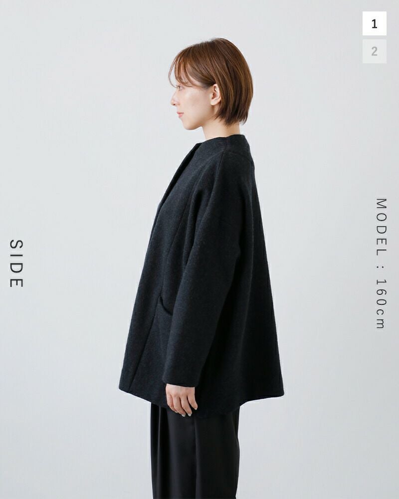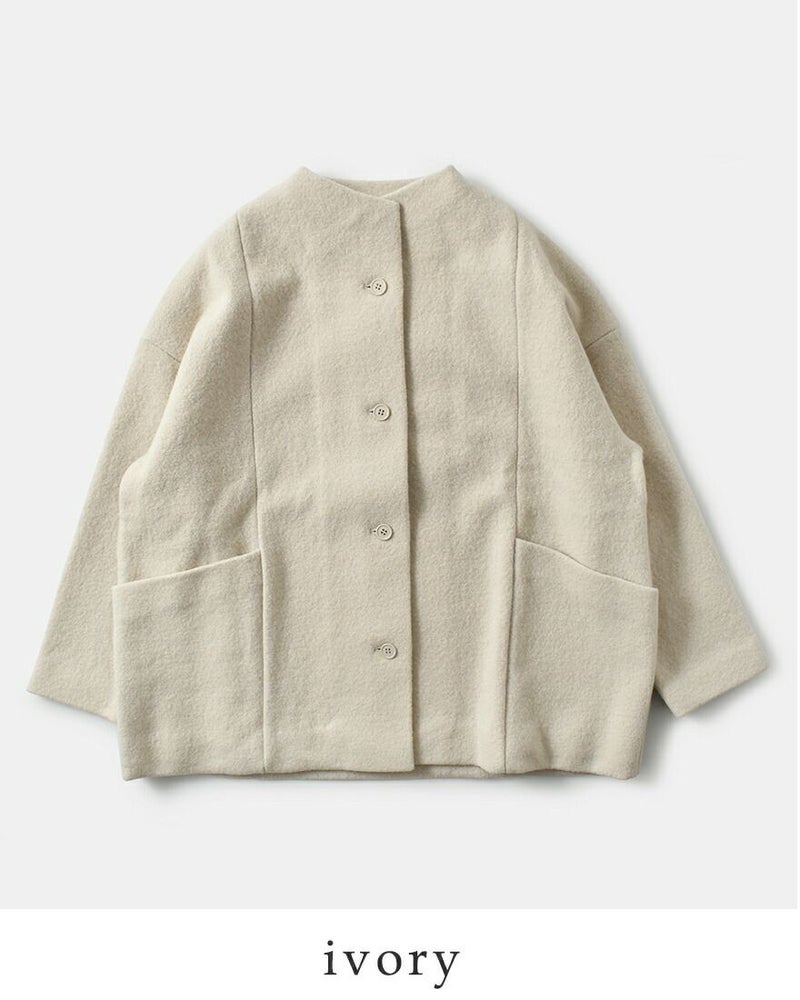 「evam eva」が毎年定番でつくっているプレスウールシリーズのショートコート。柔らかなウールをプレス加工で程よく締め、ふっくらとしながらも軽やかで心地よい仕上がりです。