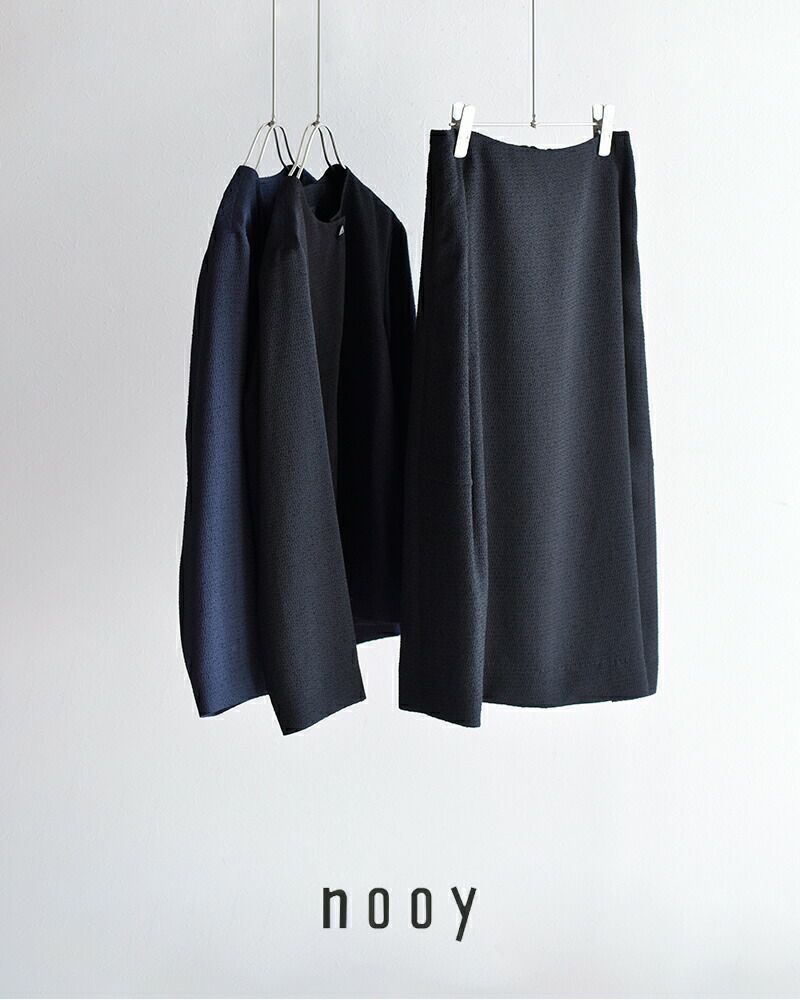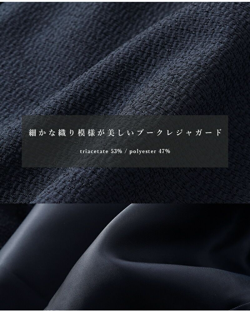 nooyの真骨頂ともいえるテキスタイル。織りで複雑な立体感をつくっているのでほのかにモードでありつつ、クラシックな雰囲気も漂わせます。細かな凹凸が光に当たるたびに奥行きをつくり、上品なニュアンスを生み出します。見た目に反して薄手で着心地も軽く、滑らかな裏地付きなので着やすさも抜群です。