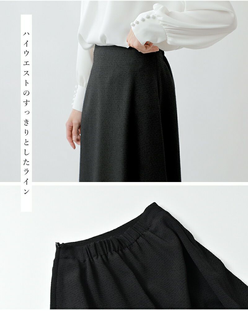 立体的なシルエットで他と差を付けるブラックフォーマルスカート。あらゆるオケージョンに対応してくれる、1枚あると便利なアイテムです。