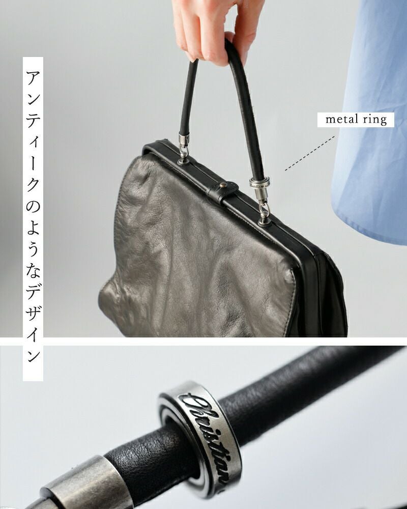 がま口がどこかレトロで愛嬌を感じるデザイン。ハンドルにはブランドロゴが刻まれたピューターリングが付いています。