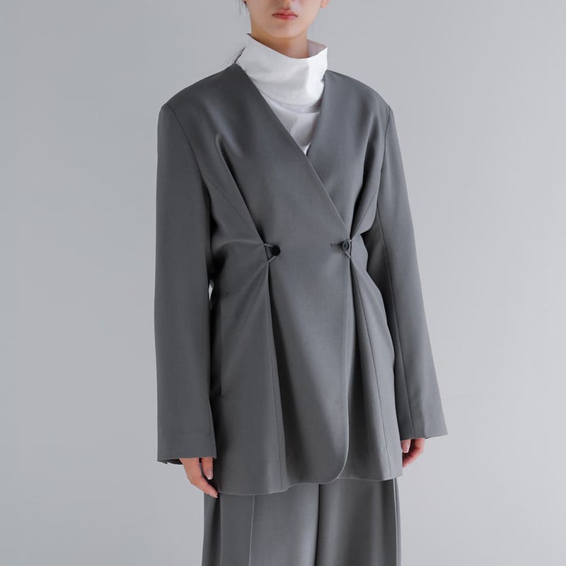 ウエスト釦を左右のループで留めて構築的なタイトシルエットとしたり、ボタンの留め方ひとつでアレンジを楽しむことができます。