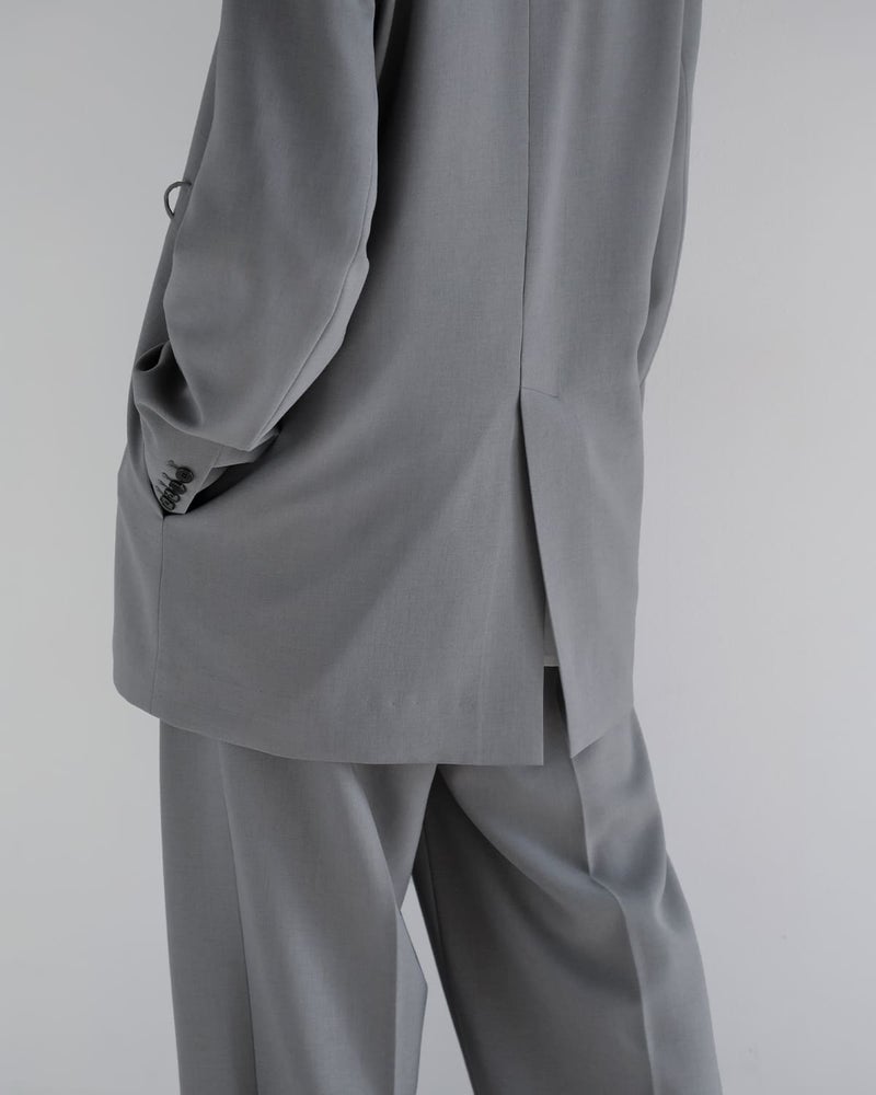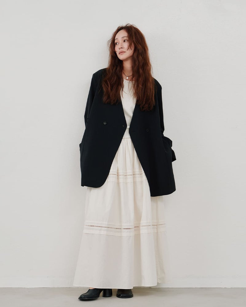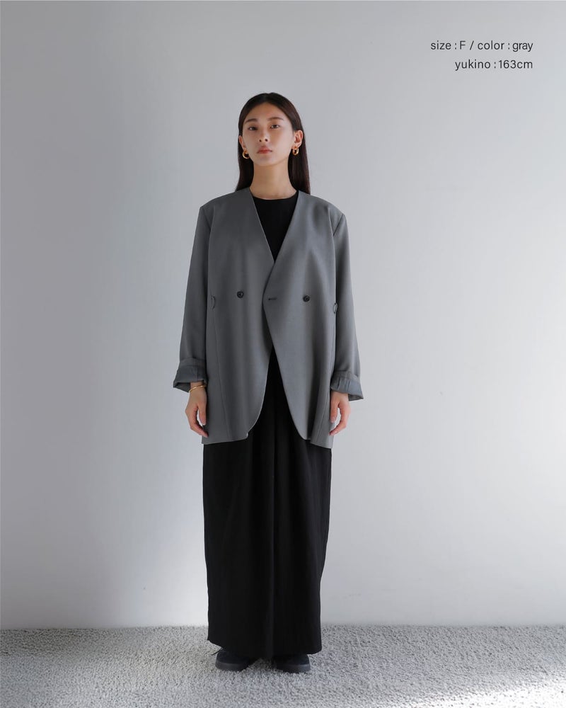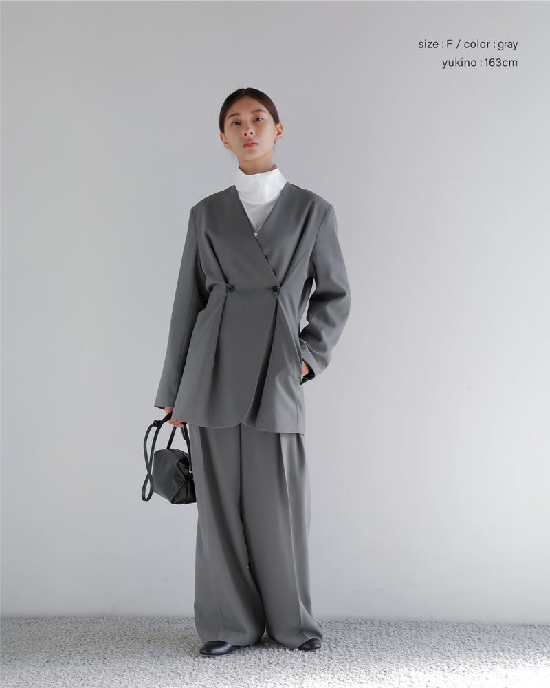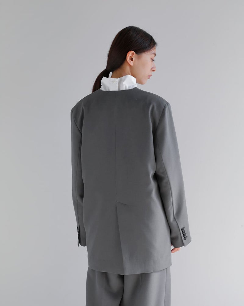 ウエストの釦を止めることで構築的なタイトシルエット、外して着用することでゆとりのあるオーバーシルエットと、表情の違う着こなしが楽しめます。同素材でお作りしたDOUBLE TUCK WIDE PANTSとのセットアップはもちろん、デニムやスカートとも相性がよく、さっと羽織るだけでコーディネートに奥行きが生まれる1枚です。