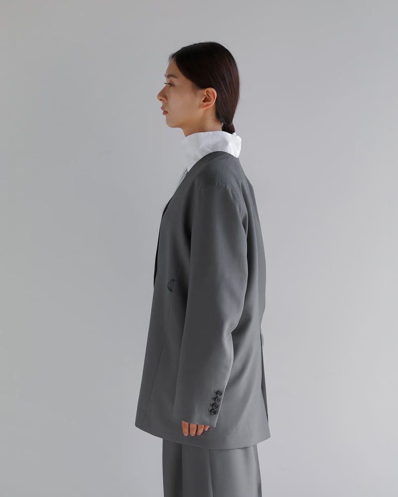 すっきりとしたノーカラーデザイン。Vカットが顔まわりをシャープに見せます。