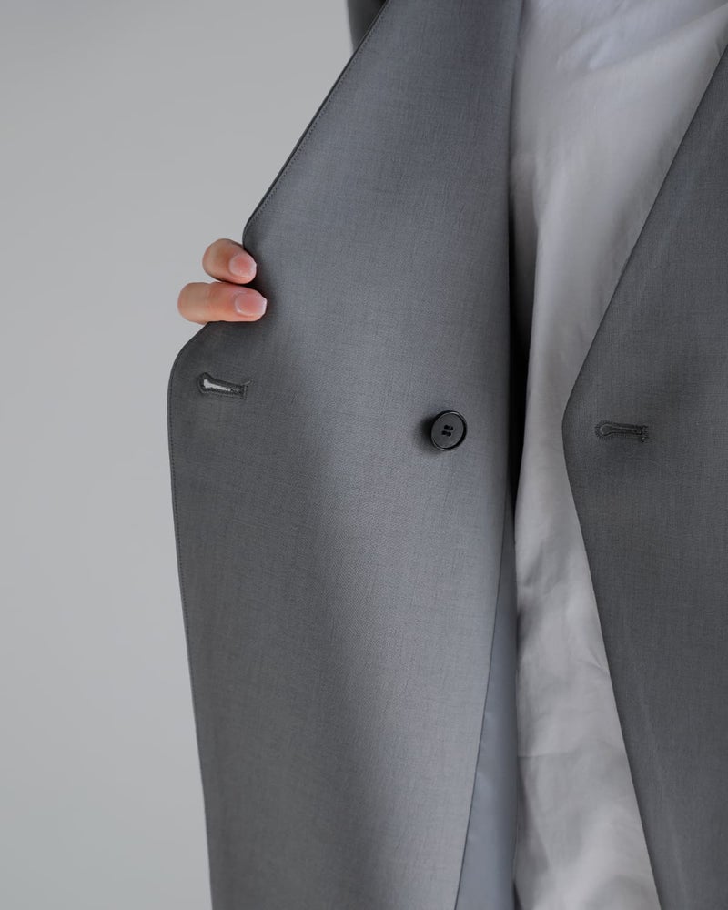 シャープなカッティングのダブルジャケット。ウエストにかけて緩やかにシェイプされたラインが、スタイリングを引き締めます。