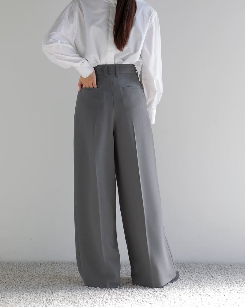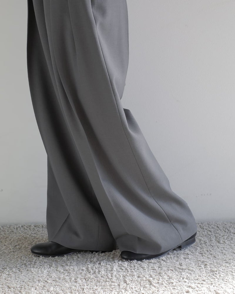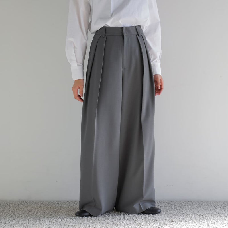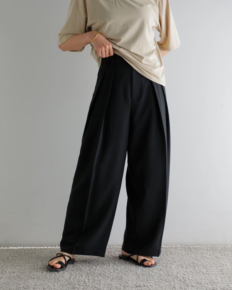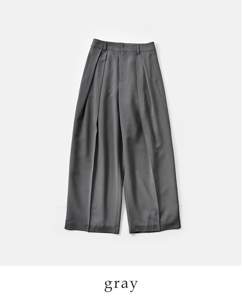 ダブルタックとセンタープレスを施したデザインでゆったりとしたワイドシルエットですが、腰まわりをすっきりさせることで、ボリュームが出過ぎず、バランスの取れたラインを描きます。