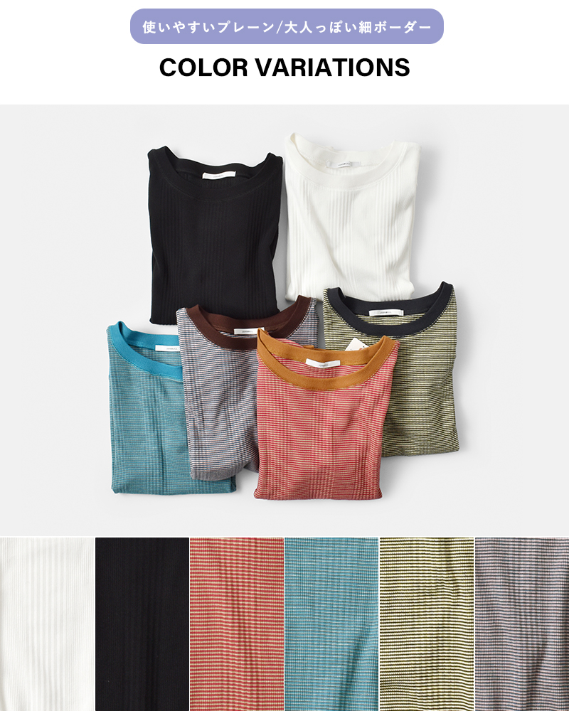 ベーシックなプレーン2色と、大人っぽい細ボーダーの6色展開。