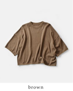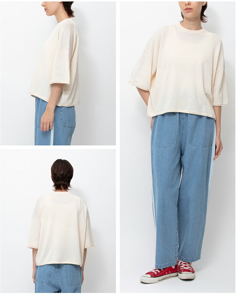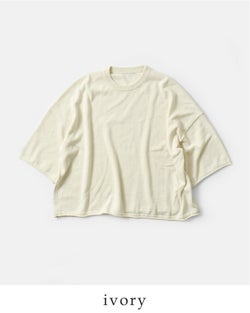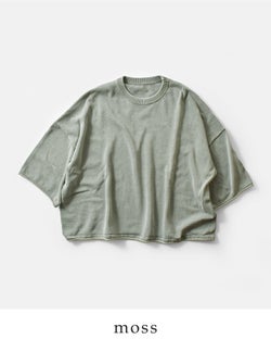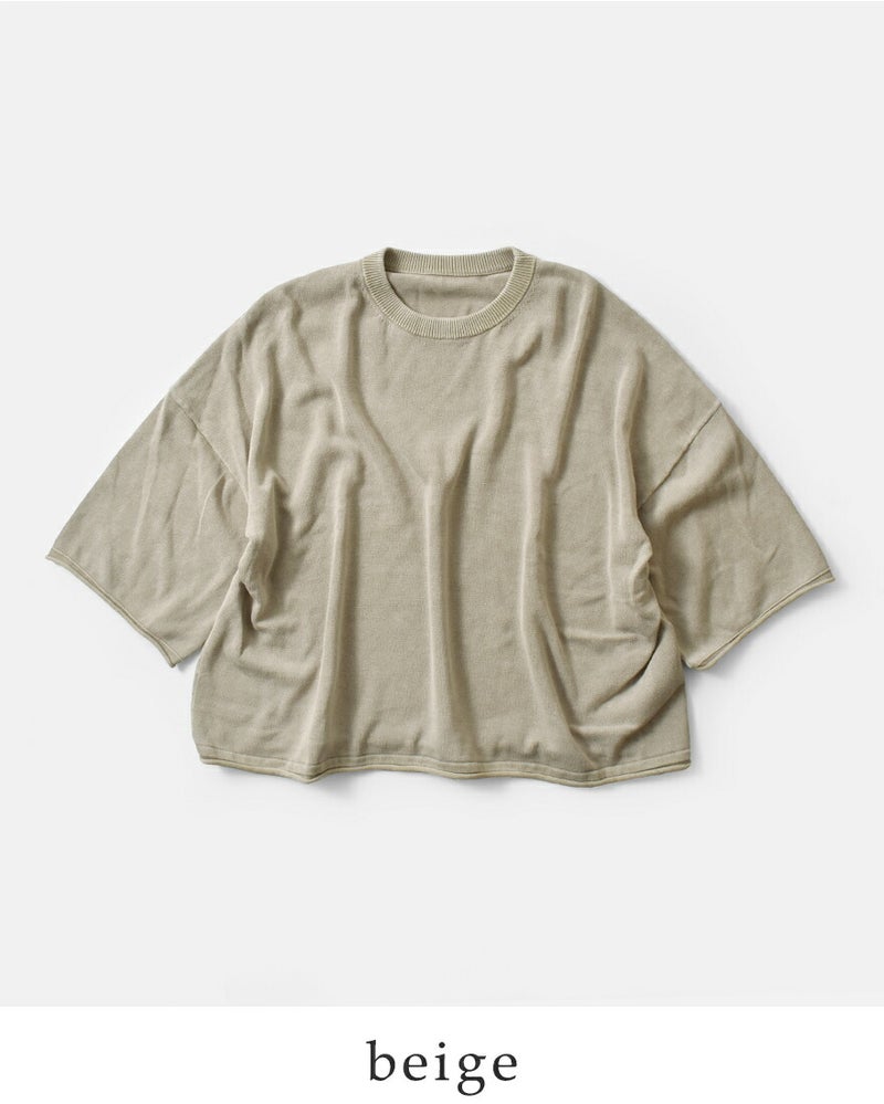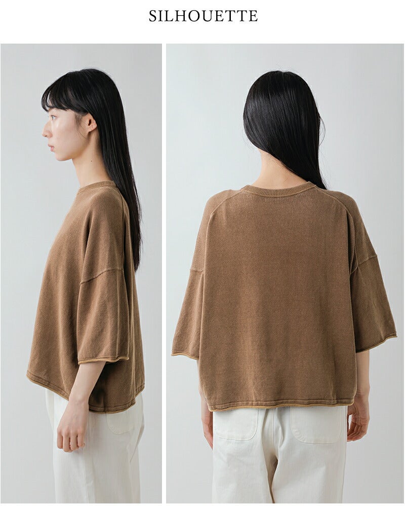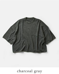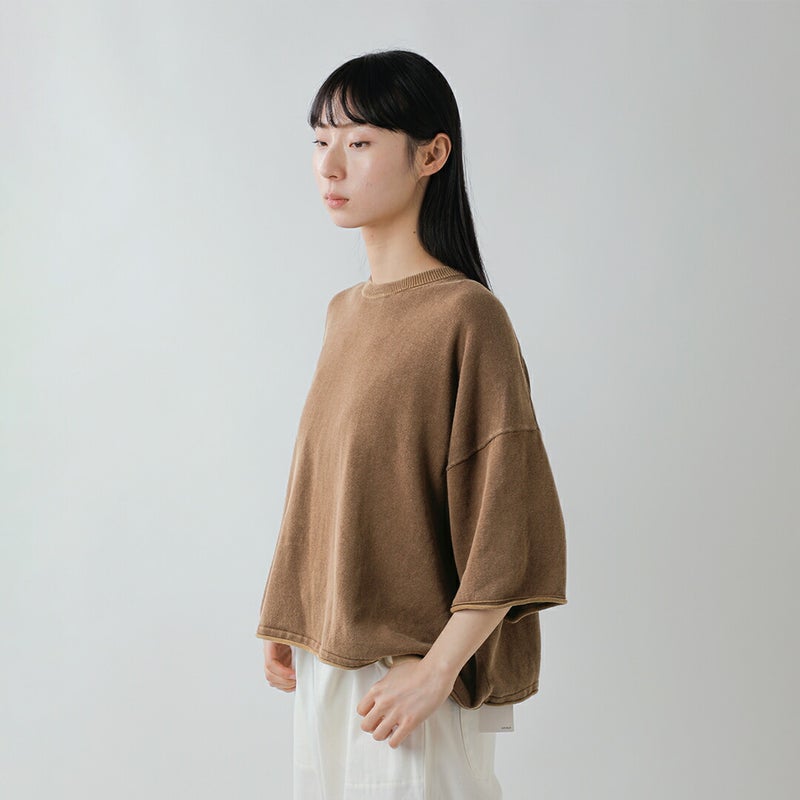 12GGの度目を詰めた天竺は、強糸ならではのシャリ味で肌離れが良く、春に最適な涼し気なドライな肌触りが特徴です。 また微配のカーリングの編み出しがこの加工ならでは新鮮な仕上がりとなりました。ビクメント染めの商品は着用するほどに色や風合いが変化していくため、個体差や経年変化を楽しむことができます。