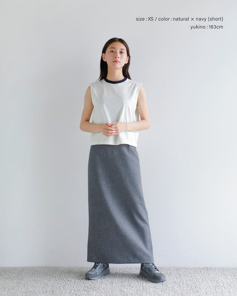 日常に馴染みながらも、確かな存在感を放つ2トーンとスリーブレスデザインが特徴。2025年春夏シーズンには、新色“Slate × Natural”が登場し、Natural × NavyやBeige × Whiteとあわせた3色展開で、装いにさりげない彩りを加えます。ショート丈とレギュラー丈から選べる2タイプ展開で、タックインしなくても決まるショート丈、日々のワードローブとして安心感のあるレギュラー丈、それぞれに魅力があります。サイズ展開もXS・Sサイズを揃え、性別・体型を問わずフィット。