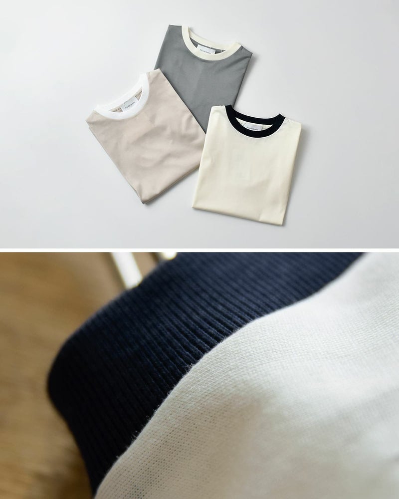 また、首周りにはボディよりもやや厚手のフライス生地を採用し、見た目のすっきり感を演出しながらも、洗濯によるヨレを軽減。さりげない工夫が長く美しく着るためのこだわりを支えています。