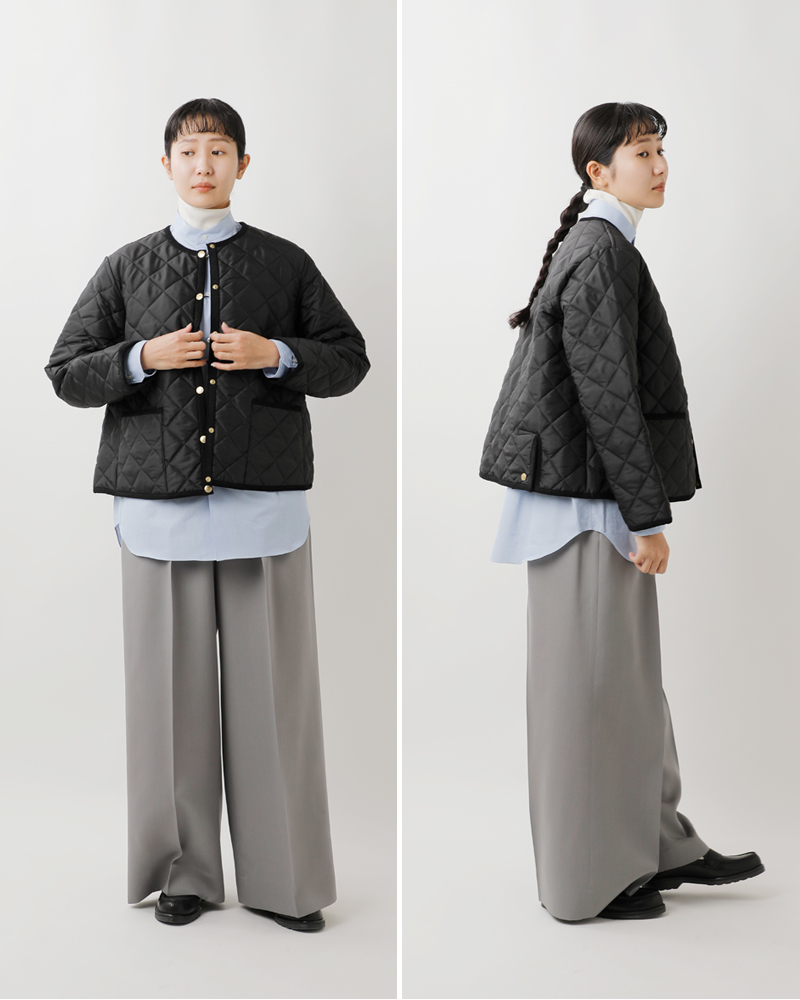 襟はコンパクトなクルーネックです。ノーカラーなので首元がスッキリと見え、タートルやストールなどとも相性抜群。暖かみのあるパイピングで縁取り、フロントにゴールドのスナップボタンをあしらい、華やかさをプラス。