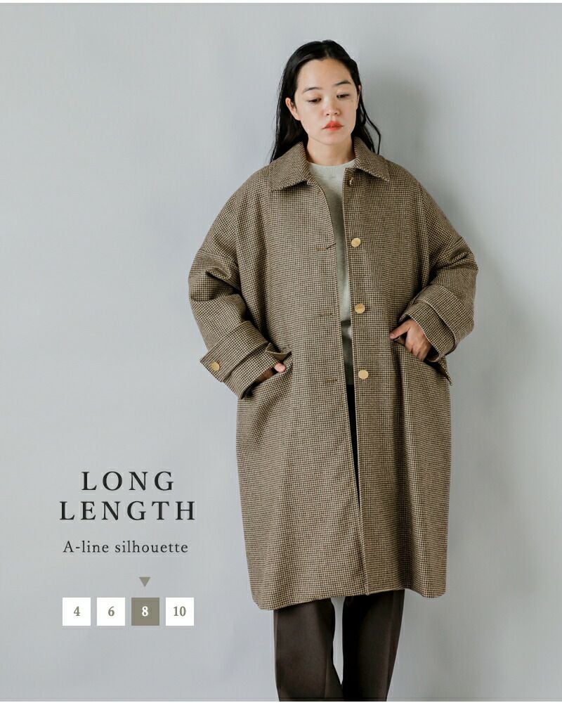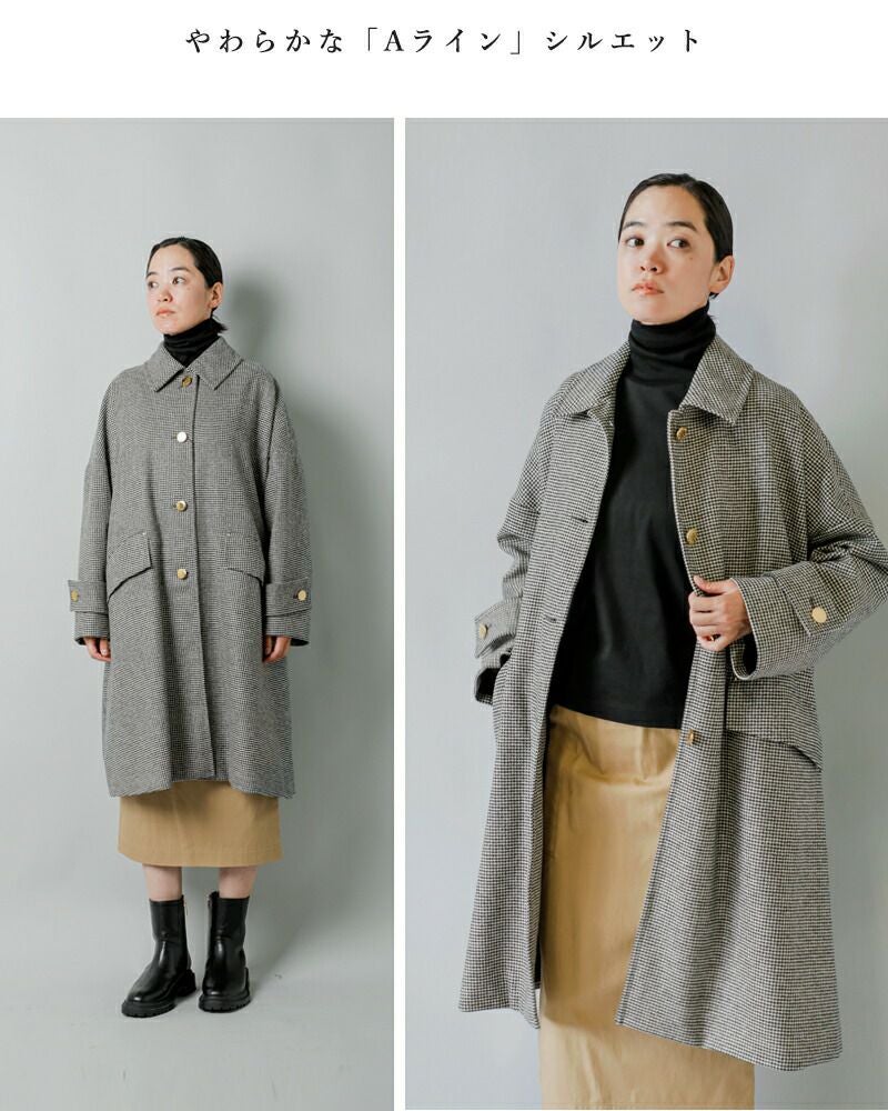ケープのような緩やかで女性らしいAラインフォルムに対して、膝がちょうど隠れるくらいの程よいロング丈が良いバランスを生んでいます。スカートでもパンツ、ワンピースなど合わせるアイテムを選ばない、スタイリングしやすいデザインです。長すぎないので足さばきも良く、動きやすいのも特徴です。