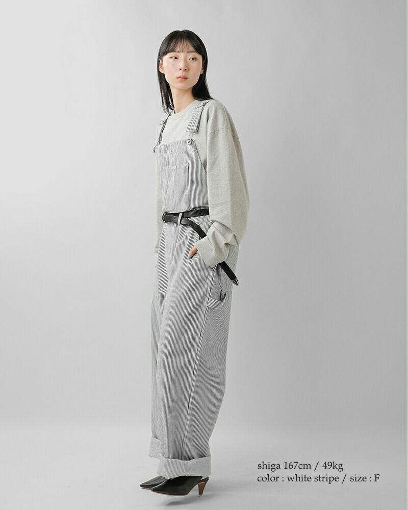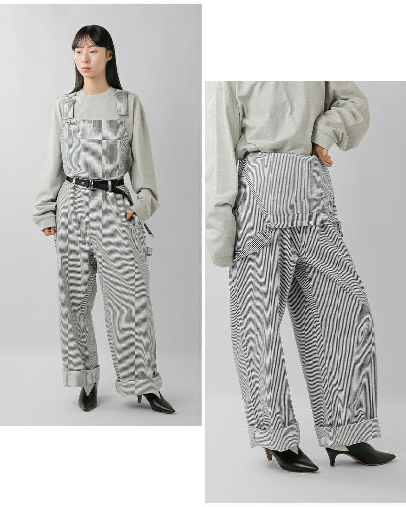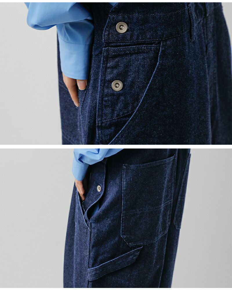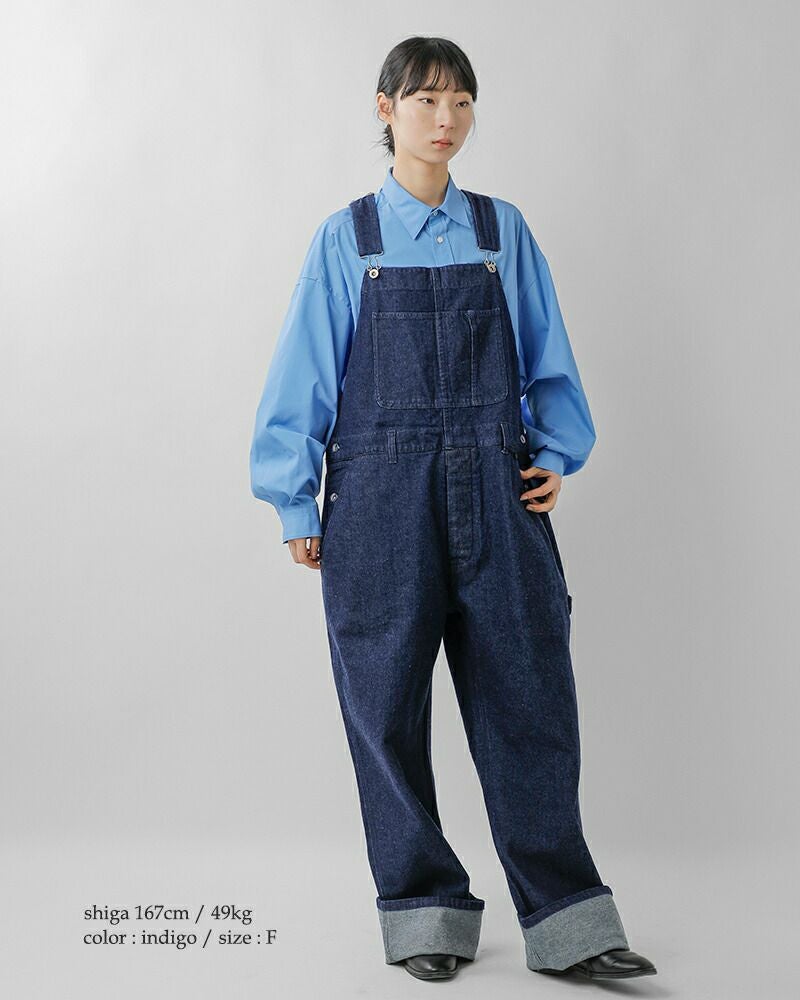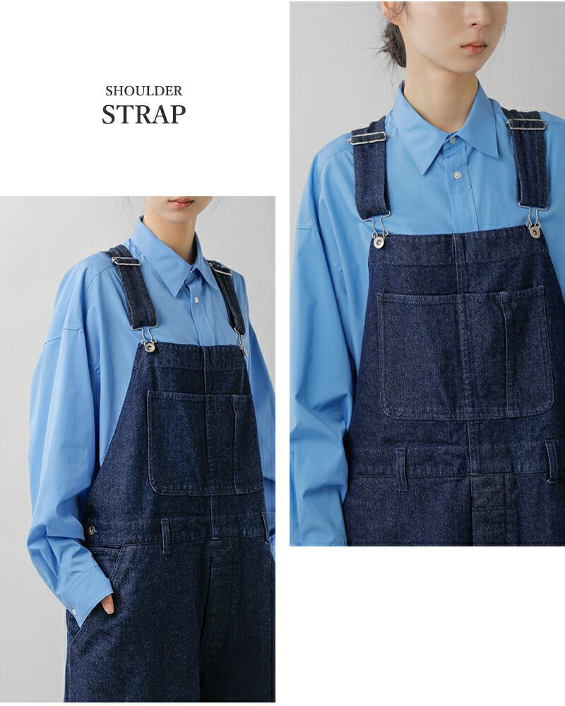 程よくルーズなワイドシルエットと長めの着丈が生む、オーバーオール特有のカジュアルな表情が印象的です。