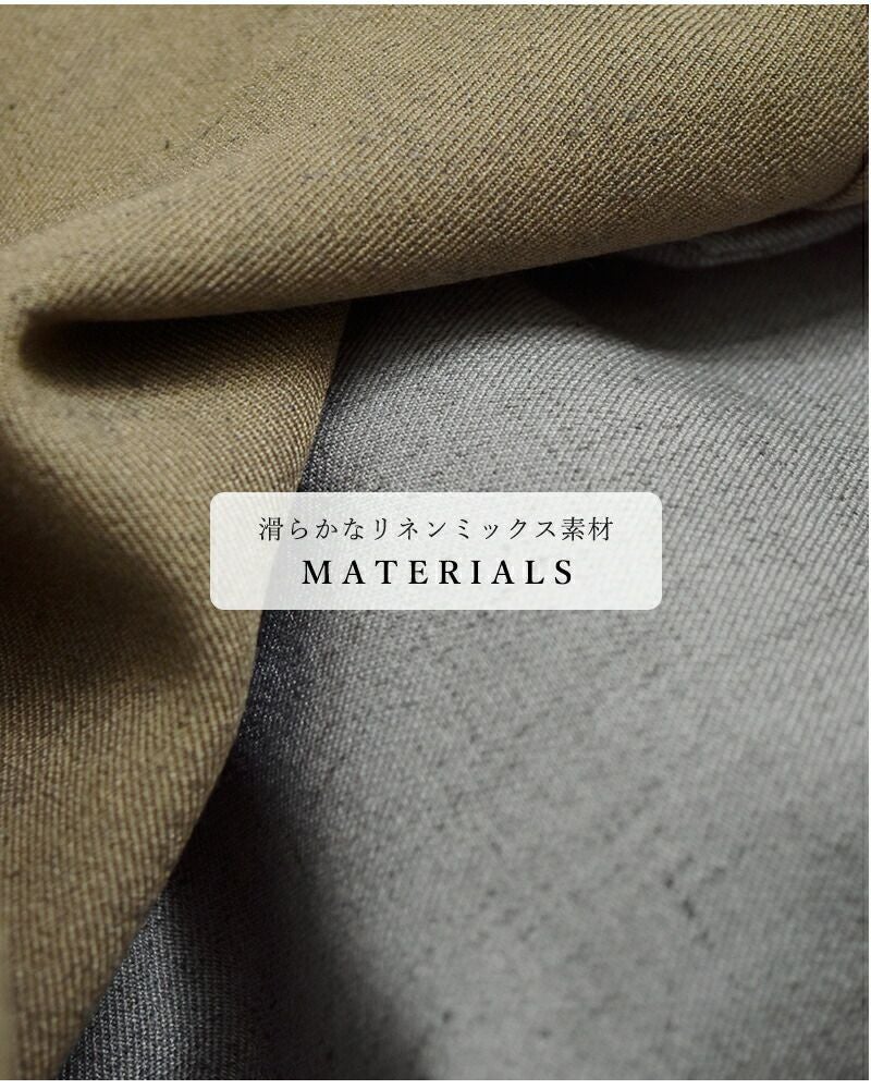 薄すぎない程よい厚みで落ち感があり、シワになりにくいリネン混の素材を使用。さらにストレッチ性を備えているため、見た目はきちんと感がありながらも動きやすく、長時間の着用でも快適。シワになりにくく扱いやすいのも嬉しいポイントです。