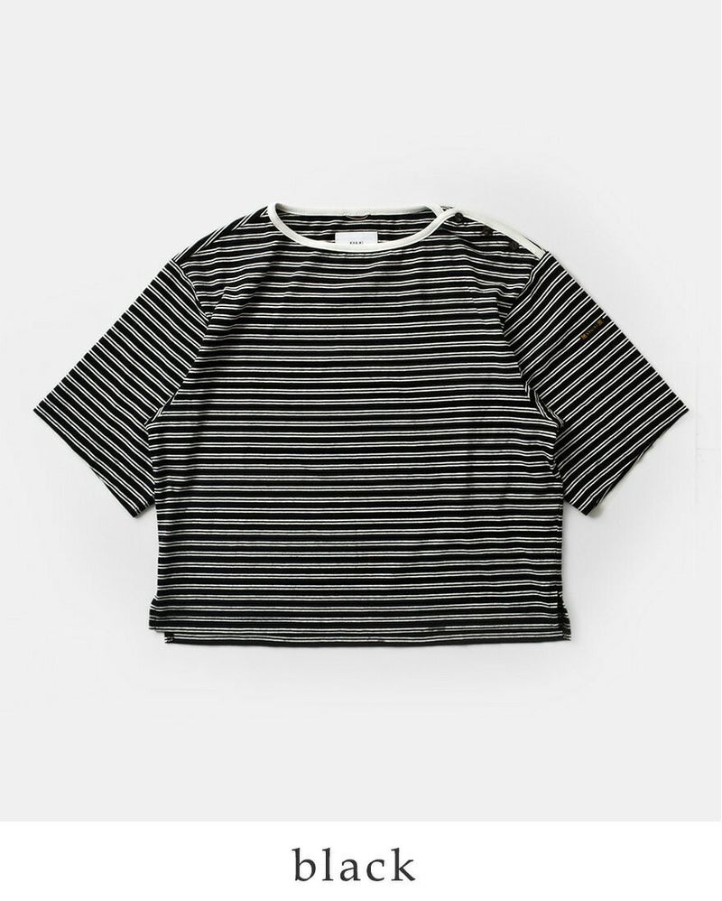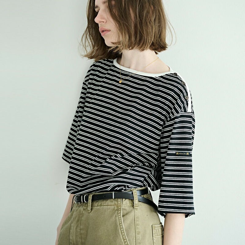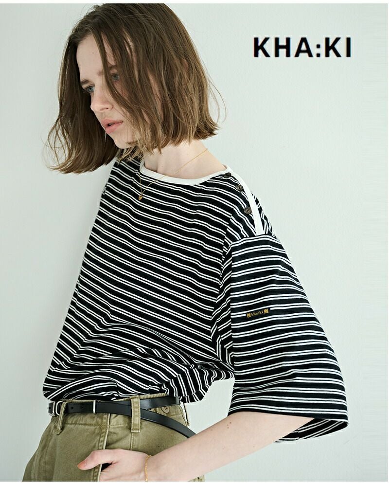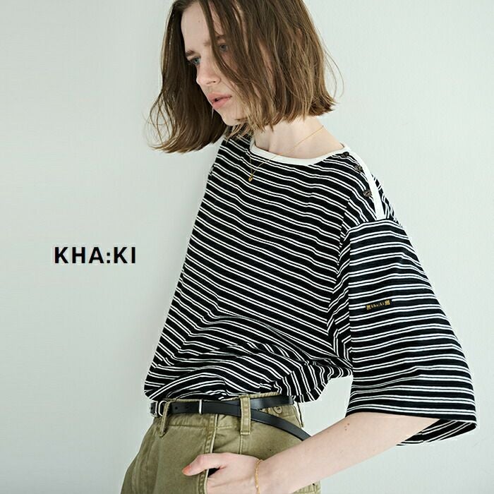 kha:ki(カーキ)コットンマルチボーダーボートネックハーフスリーブカットソー“MULTISTRIPEDTOP”mil26hcs3481