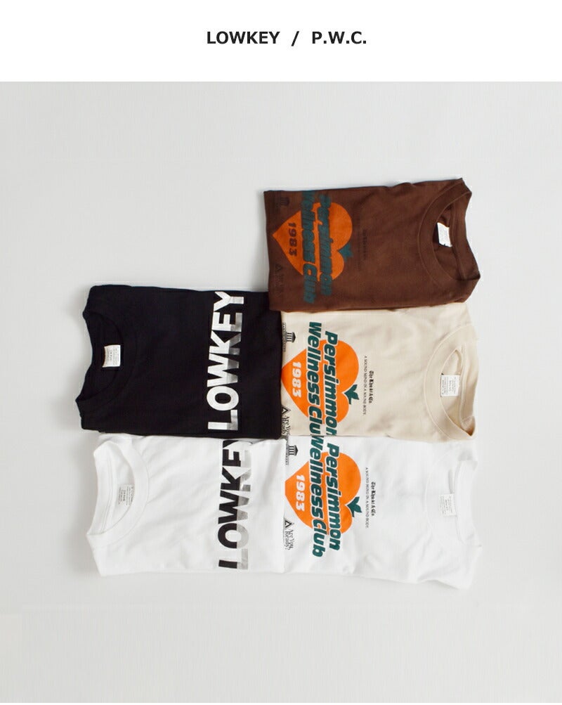 ■LOWKEY ラバーとフォイルの2トーンでプリントしたロゴが特徴。スラングとして使われるLOWKEYを2種のプリント手法で上下にセパレートしてプリントしました。 ■P.W.C. 架空のスポーツクラブのロゴを前面にプリント。KHA:KI=KAKI=PERSIMMON!? 様々な意味合いをキャッチーなロゴに込めました。