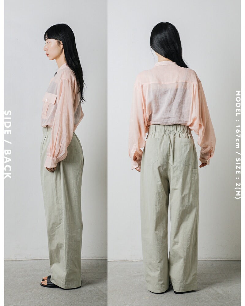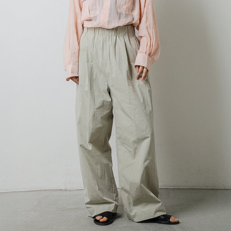 ワッシャー加工を施したナチュラルなシワ感のある綿/ポリエステルのライトウェザーを使用したワイドイージーパンツ。
