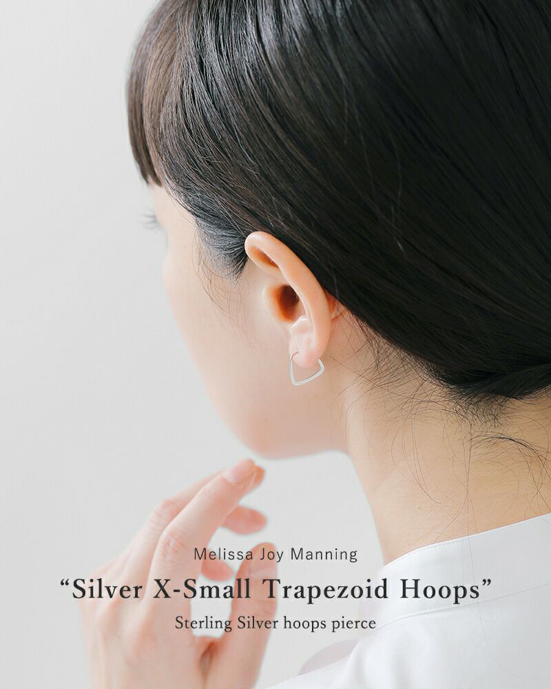 Melissa Joy Manning(メリッサ・ジョイ・マニング)より、スターリングシルバー トラぺゾイド フープ ピアス “Silver X-Small Trapezoid Hoops”のご紹介です。台形型(トラペゾイド)がモダンな形のピアス。直径1mmほどの丸い棒状の金属のみを使い、1点1点丁寧にハンマーで叩いて作られた楕円形のピアス。またワイヤーのみで作られたピアスは余計なパーツがなく、とても軽く、デイリーにお使いいただくピアスとしては最適です。きっと末永く愛用していただけるモノになることでしょう。