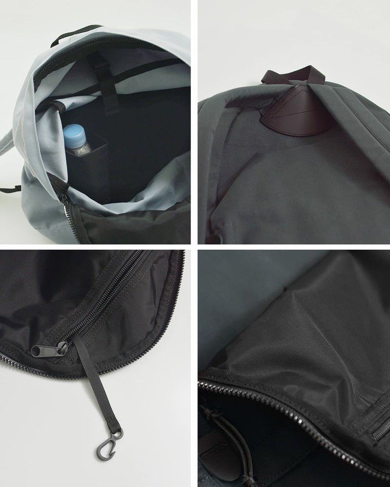 内側にボトルなどが入る折り畳みホルダーが設置してあり便利です。ショルダーの付け根には、補強用レザーパーツを配置。フタ裏にキーフックを備えたファスナーポケット、裏地にはリサイクルナイロンオックスを使用しています。