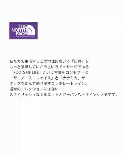 私たちの生活するこの地球において「自然」をもっと意識していこうというメッセージである「ROOTS OF LIFE」という言葉をコンセプトに、「ザ・ノース・フェイス」と「ナナミカ」がタッグを組んで送り出すコラボレートライン。通常のコレクションにはないスタイリッシュなシルエットとアーバンなデザインが人気。