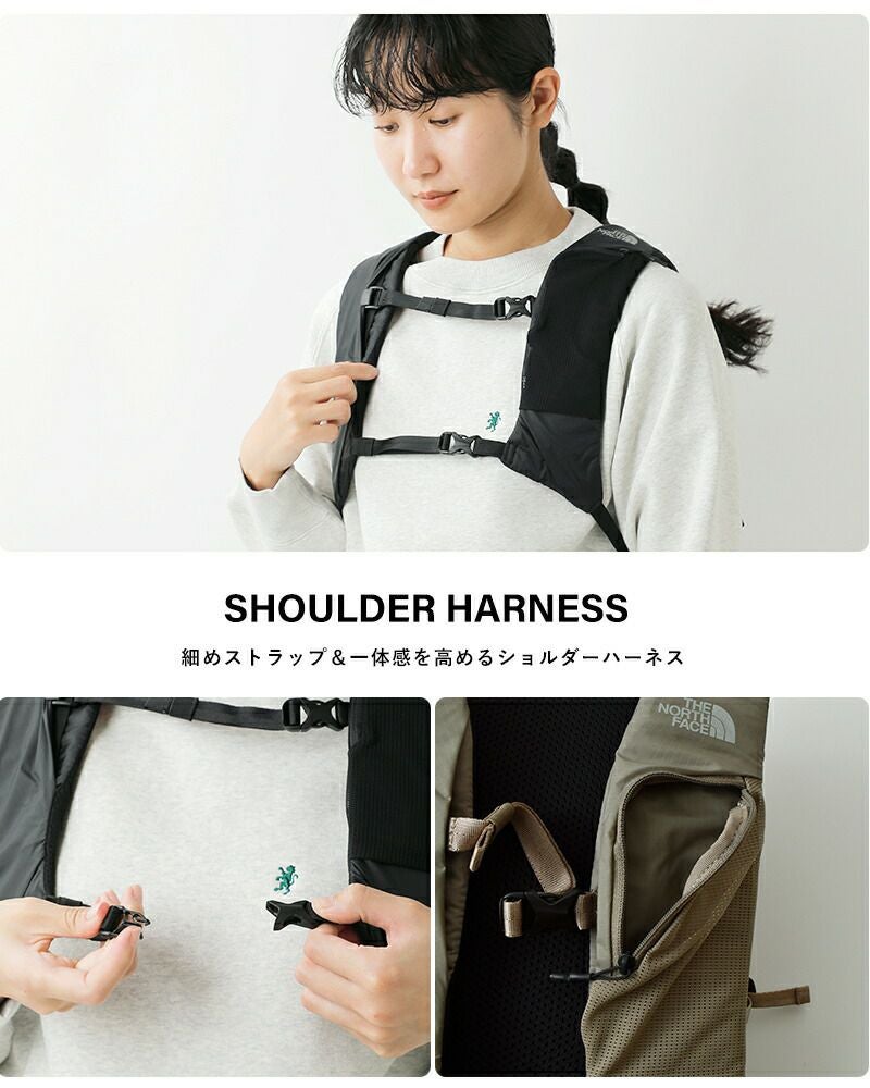 ランニングシーンのバックパックの揺れを抑えるため、ショルダーハーネスはベスト型に近いデザインで、体との一体感を高めています。チェストストラップはテープ式レールを採用、フィット感を高めながら胸への当たりを軽減。左ショルダー部分にはスマホが入るメッシュのファスナーポケット付き。下部のチェストストラップは収納可能です。