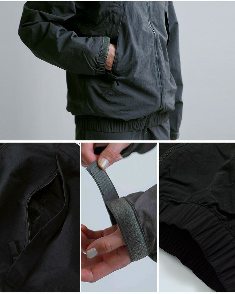 ●左右にはファスナーポケットを配置し、スマートフォンや小物の収納も安心。 ●袖口は面ファスナー仕様で、好みに合わせてフィット感の調節が可能。 風の侵入を防ぎ、アクティブなシーンにも対応します。 ●裾はフィット感のよいゴム仕様。 シルエットに程よい丸みと安定感をプラスします。