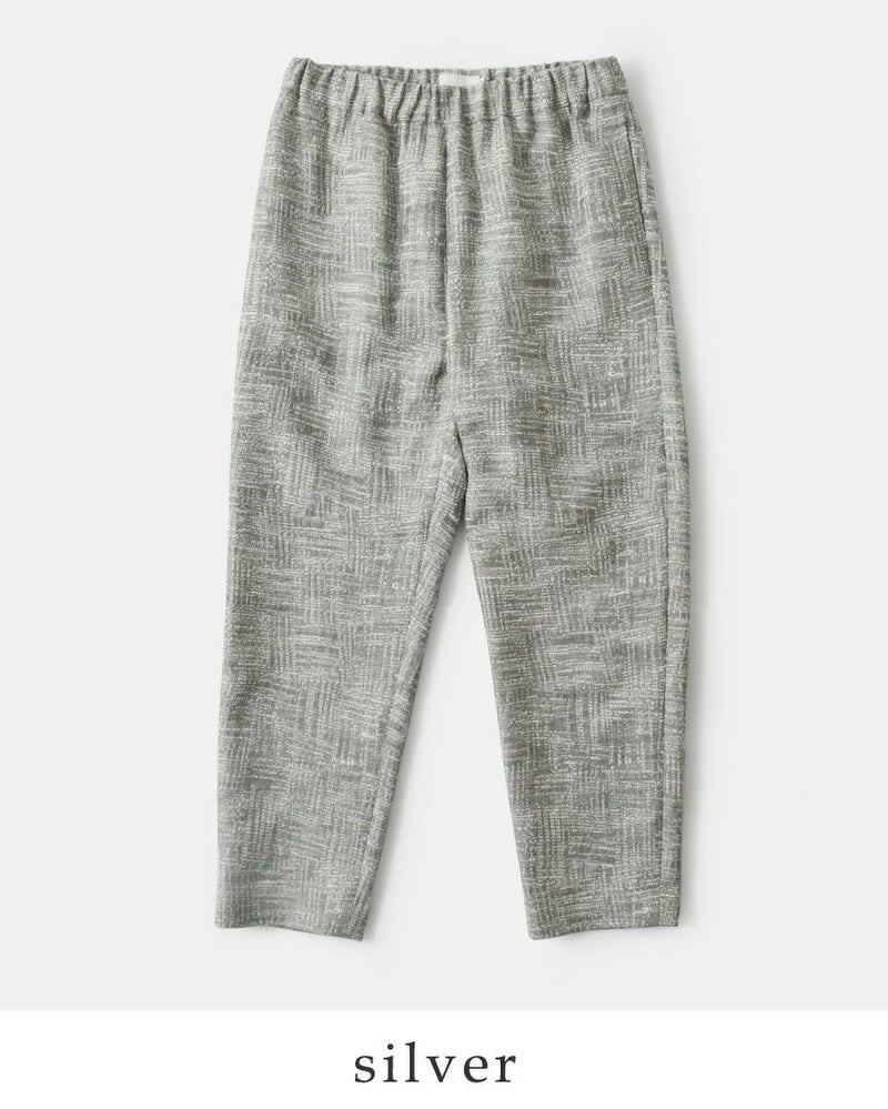 nooy(ヌーイ)よりイタリアンジャガード ペン パンツのご紹介です。上品できちんと感の備わったフォーマル対応のパンツです。ジャガード生地がセンスよく、堅苦しいフォーマルスタイルが苦手な方におすすめ。裾に向かって細くなるテーパードシルエットで、スタイルアップ効果もしっかりあります。ウエストはゴム仕様で、ストレスなく楽に穿いていただけるのもポイント。同生地のジャケットとのセットアップスタイルもお楽しみ頂けます。