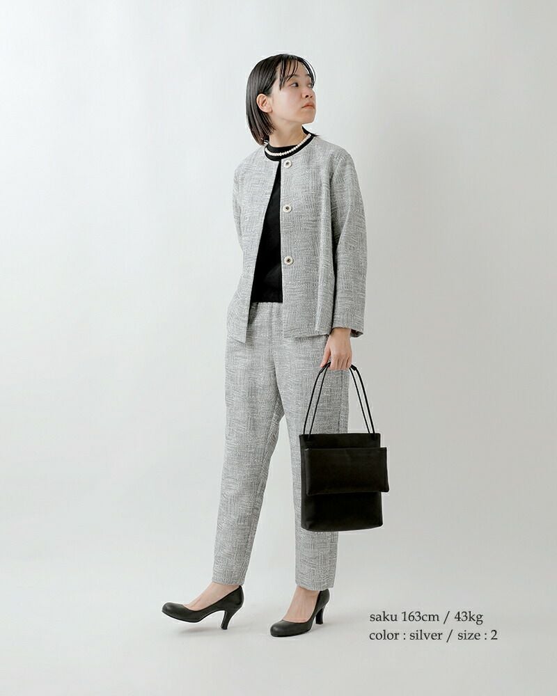 cotton76% polyester24% 他とは違ったセレクトのフォーマル生地に定評のあるnooy。こちらのパンツに使用しているのは刺繍のような凹凸のあるイタリアンジャガード生地です。華やかだけど落ち着いたシックなカラーリングで、きちんと感とおしゃれを両立出来ます。