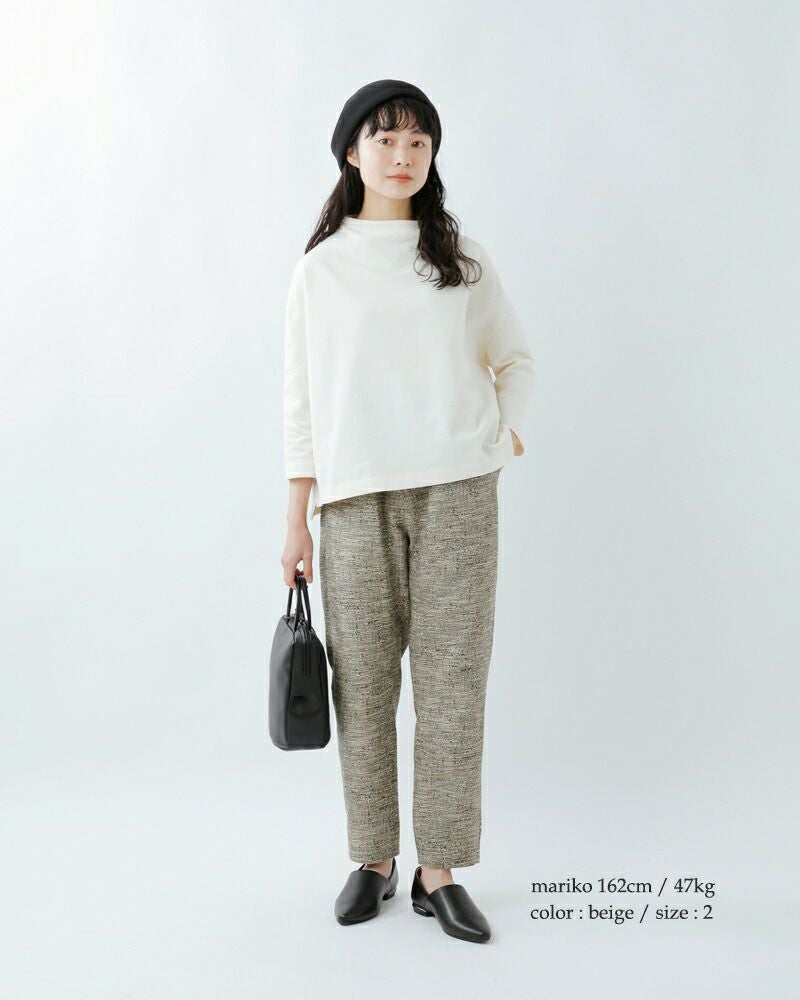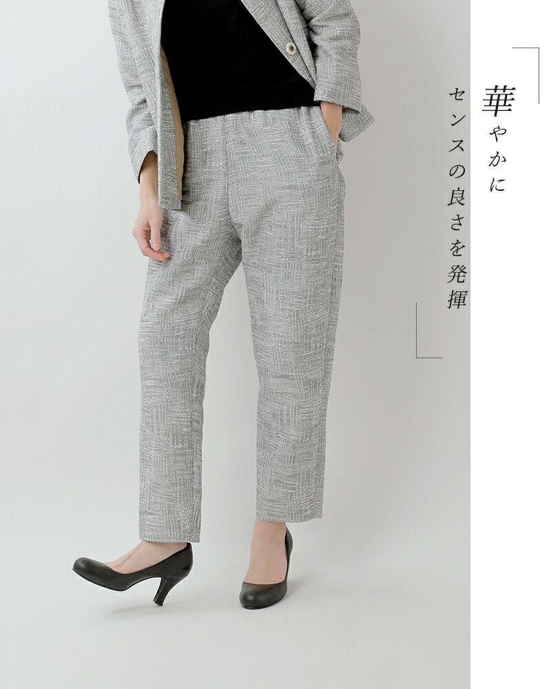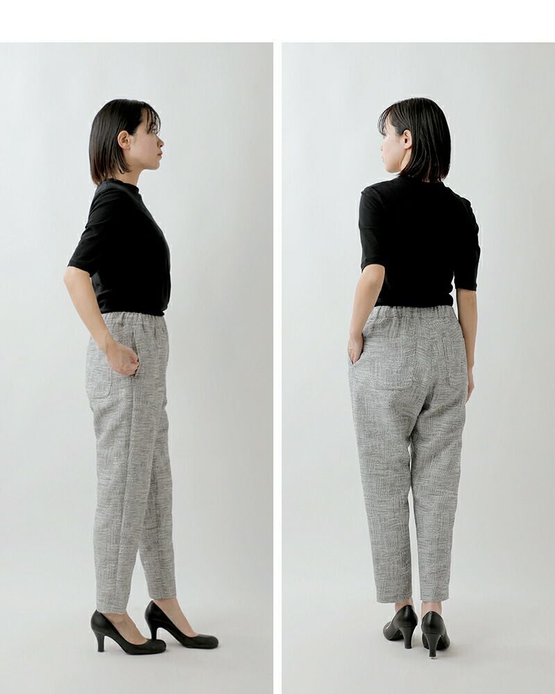 裾に向かって緩やかに細くなるテーパードシルエットです。太ももから裾まで、全体的にゆとりがあるので、窮屈感がなく、ストレスフリーな穿き心地。体型カバー効果も発揮してくれます。フルレングスよりも少し短めのクロップド丈で、裾がもたっとすることなく、足元はすっきりと綺麗に見えます。
