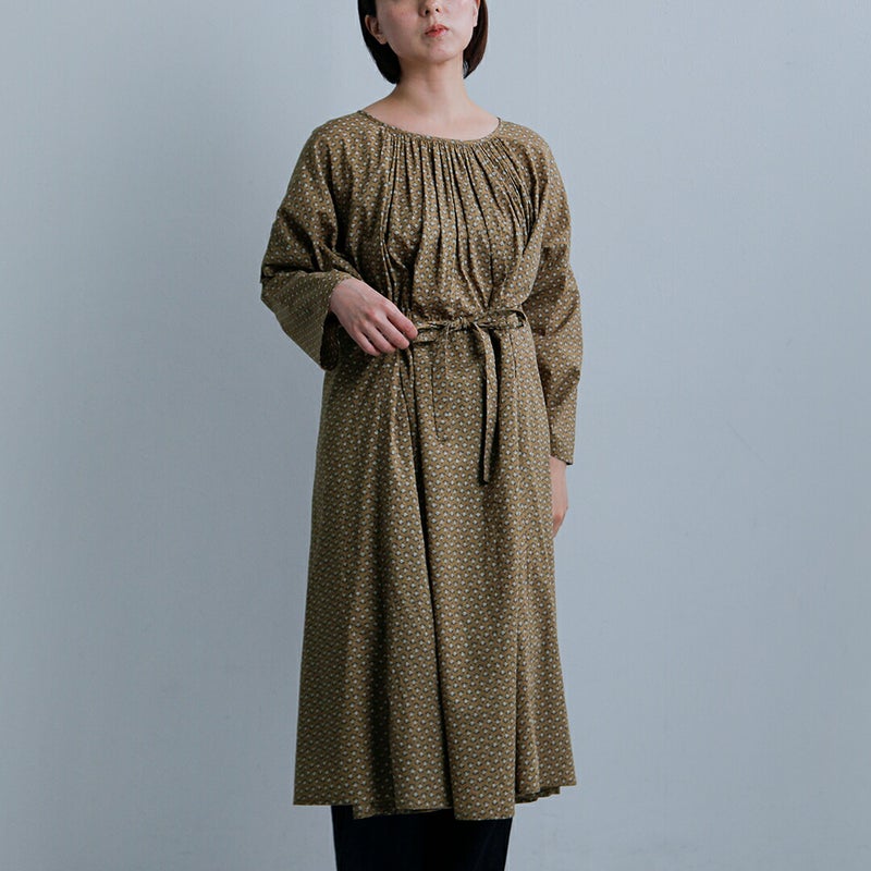細かな花柄を全面にあしらい、落ち着いた配色でまとめた、やさしい雰囲気漂うシリーズ。素材には、薄手で軽やかなコットンボイルを使用し、肌に直接触れても心地よい、ふんわりと柔らかな生地感が魅力です。前後どちらでも着用できる2way仕様のチュニック丈スモック。ゆったりとした身幅に、襟元から広がるギャザーが美しいドレープを生み、女性らしい柔らかな印象に仕上げられています。さらに、サイドの紐をリボンのように結ぶことで、シルエットや表情の変化を楽しめる一枚です。