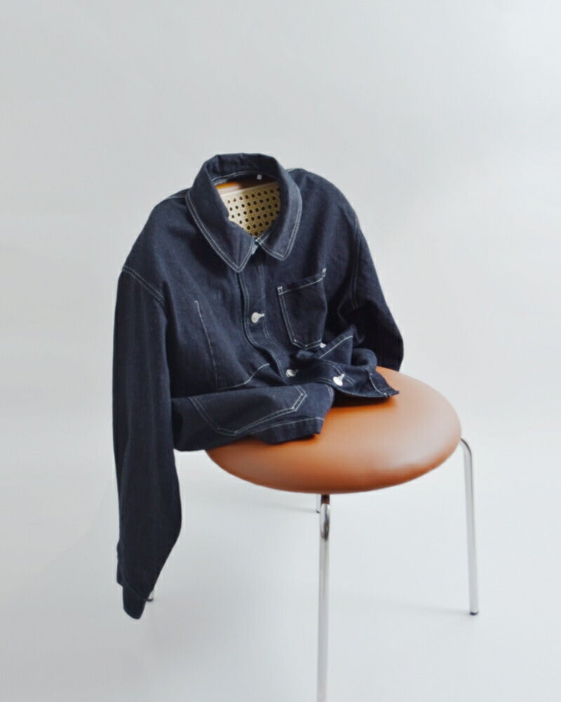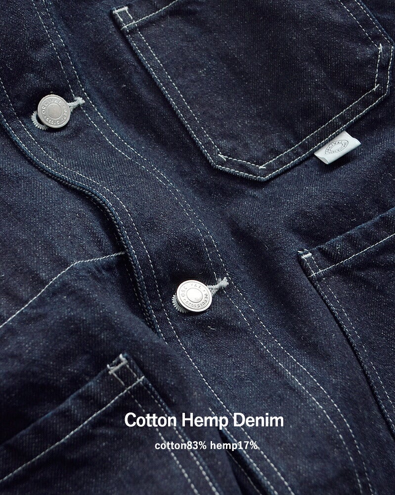 綿と麻(ヘンプ)を混ぜたデニム生地を使用。麻特有のシワ感とドライな質感が特徴です。軽さがあり、柔らかいデニム生地で、羽織りやすく、通年で使いやすい生地感です。