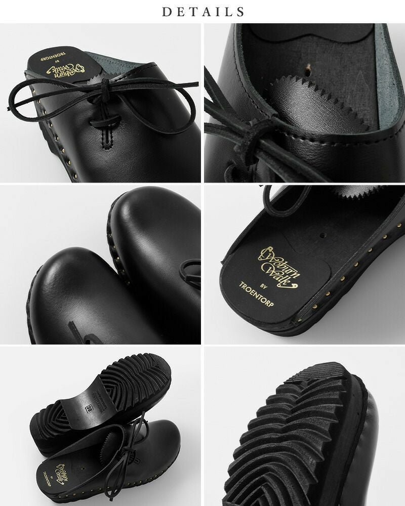 WOBURN WALK(ウォーボーン ウォーク)×TROENTORP(トロエントープ)よりカウハイド サイドレース サボ サンダル “Swedish Clog Alps”のご紹介です。クラシックなクロッグのアッパーに、レザーレースのデザインを加えた一足が登場です。アッパー、フットベット、アウトソールのカラーリングはすべてブラックに統一し、特徴的なネイル(釘)やヒールロゴのゴールドが映えるデザイン。シュータンにはピンキングの装飾が施されています。伝統的なルックスを活かしつつ、デザイン性をプラスした仕上がりです。足を滑り込ましてサッと履けるサンダルタイプですが、革とネイルの上品さで、カジュアルなコーデでもさりげなく高級感を演出できるアイテムです。