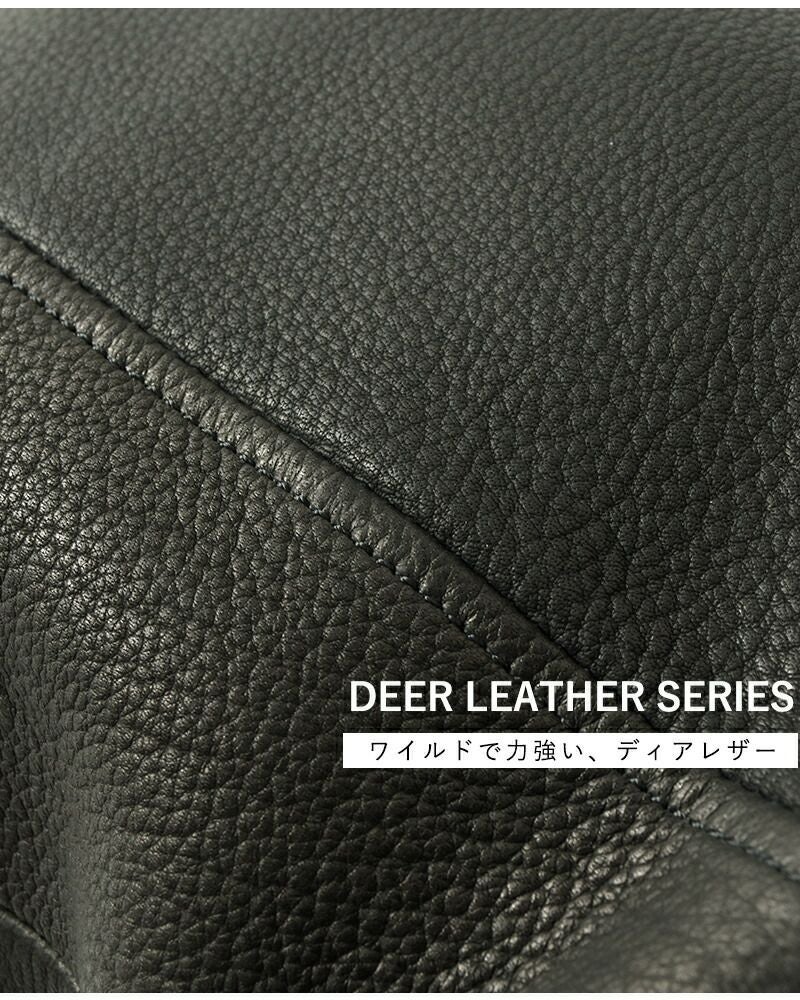 ディア・レザーは丈夫で柔らかく、使い込むほど魅力が増す素材であることから、古来より馬具や武具、足袋などに使用され、またネイティブ・インディアンが衣料品や装飾品として愛用していることでも知られています。マットな艶感と独特のシボ感がマッチした、上質さが感じられる素材です。