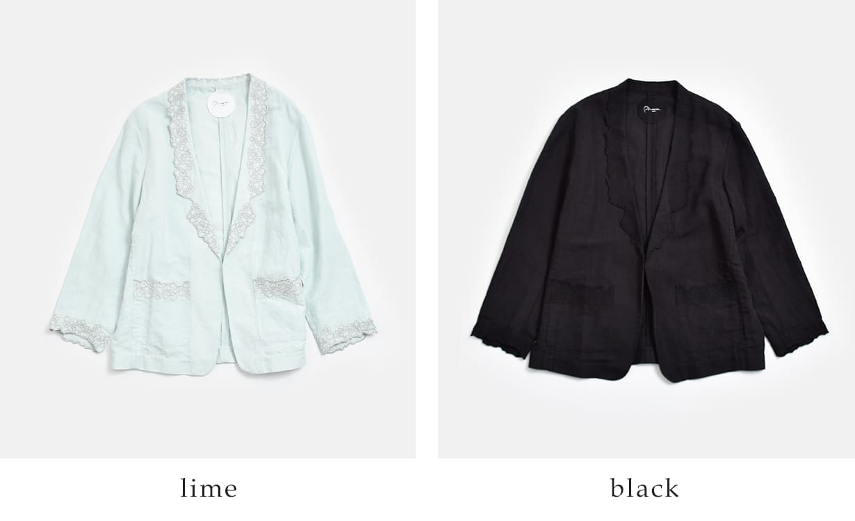 襟元・袖口・ポケットに配された刺繍が印象的な、コットンリネンジャケット “Stella”。