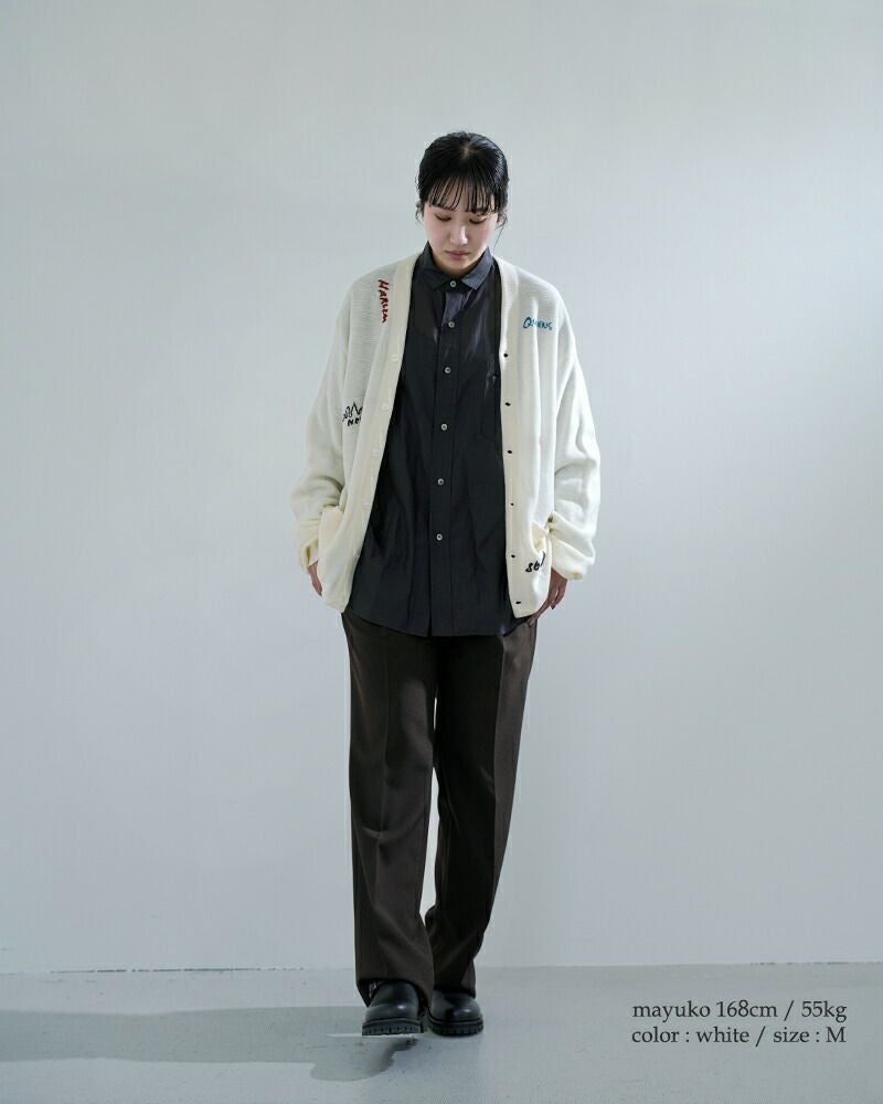 編み地は、オリジナルを再現した横づかい12ゲージのアクリル糸を使用し、ガーター編みで製作。さらに製品でシャギー加工を施すことで、毛足を立たせ、古着のような風合いを表現しています。アクリル素材ならではの柔らかな着心地と、家庭で洗濯可能なイージーケア性も魅力。見た目の雰囲気だけでなく、日常使いしやすい実用性も兼ね備えています。