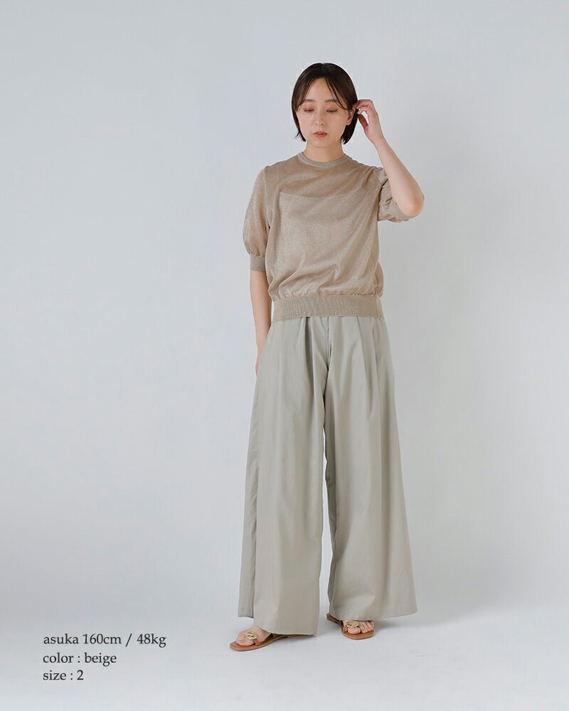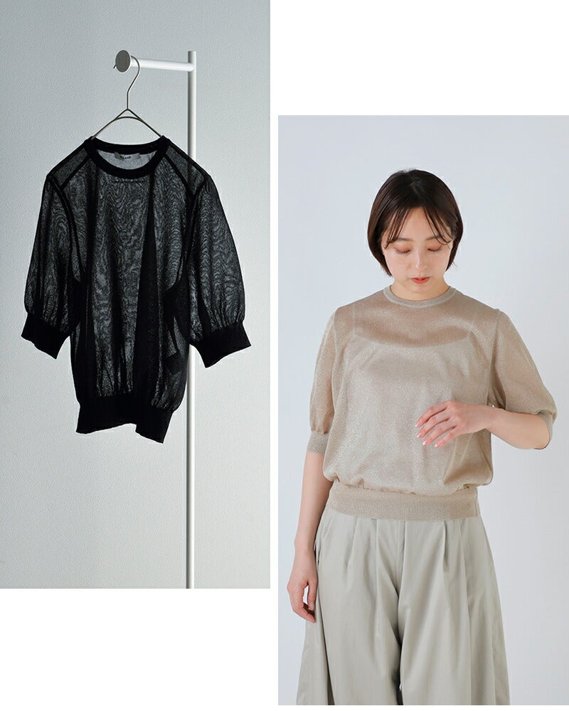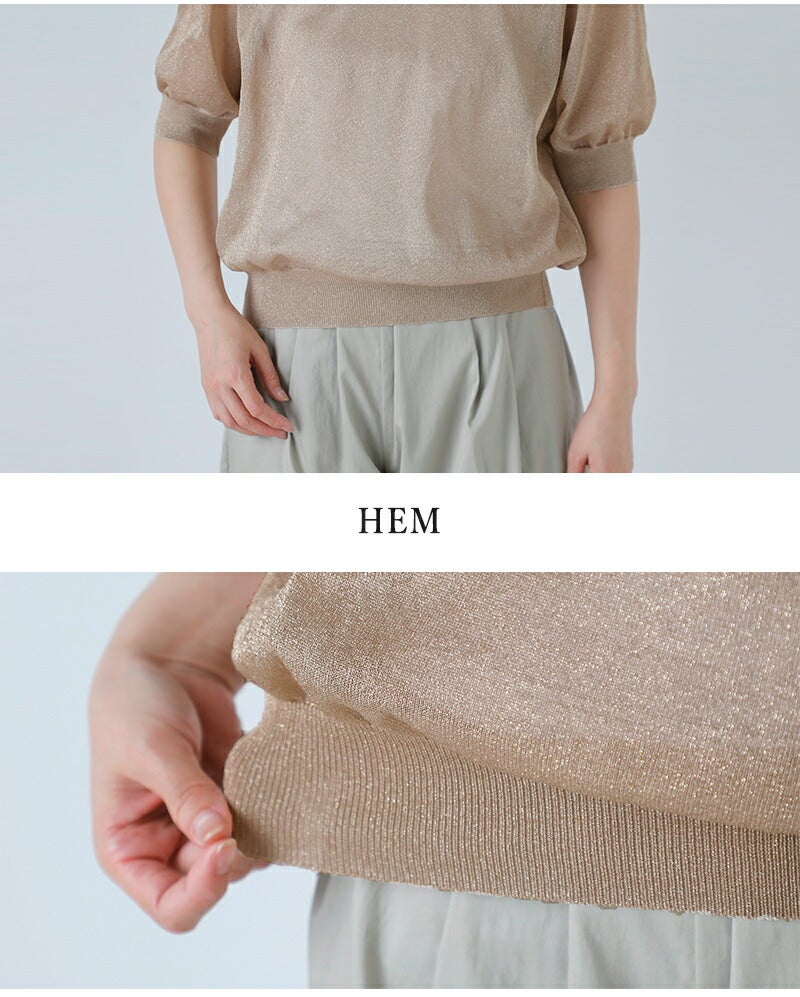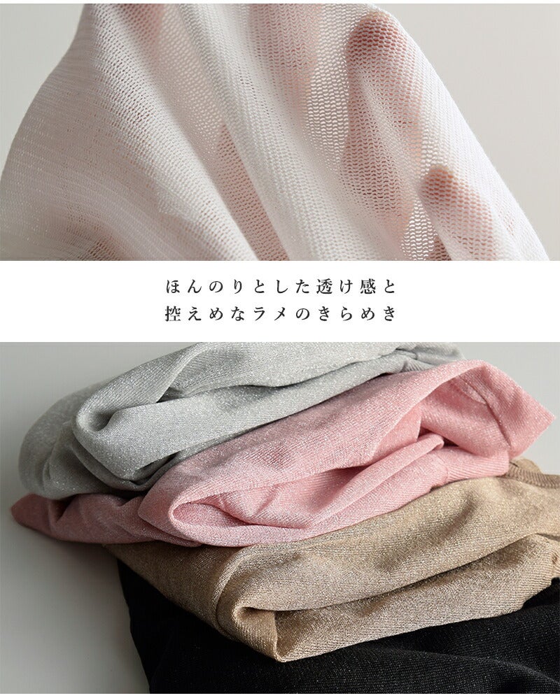表側には上品なきらめきのラメ糸、裏側にはオーガニックコットン×リサイクルポリエステルの混紡糸を使用した、12ゲージ二重臼天竺編み。 繊細なシアー感がありながら、ラメ特有のチクチク感を抑えたさらっとした肌当たりと、程よいハリ・安定感を兼ね備え、きれいなシルエットを保ちます。 ご自宅で手洗い可能なイージーケア仕様も、デイリーに取り入れやすいポイントです。