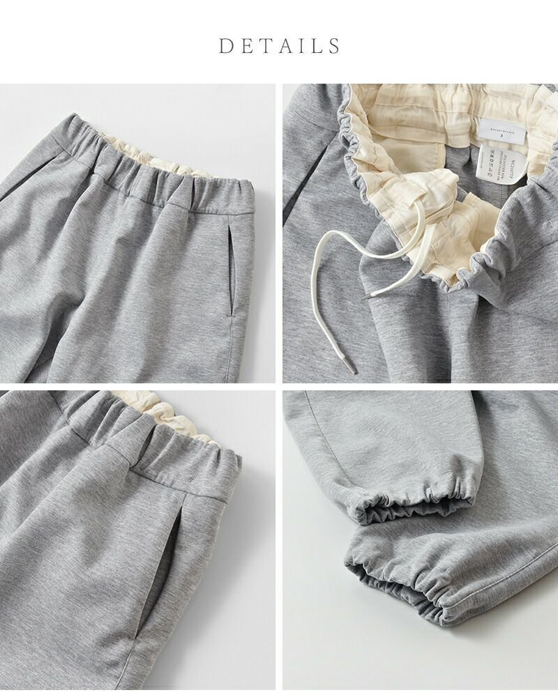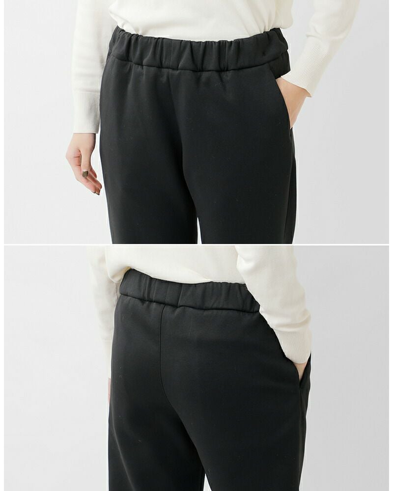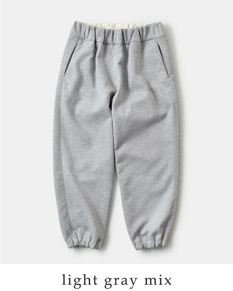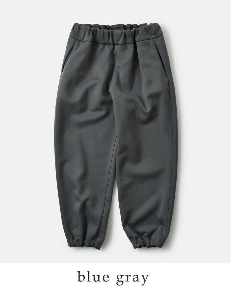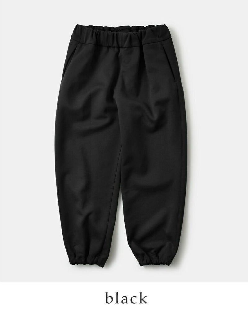 ウエストは総ゴム&紐でフィット調整が自在。脇には前後にシームを利用したポケットを配し、ミニマルな見た目に実用性をプラス。