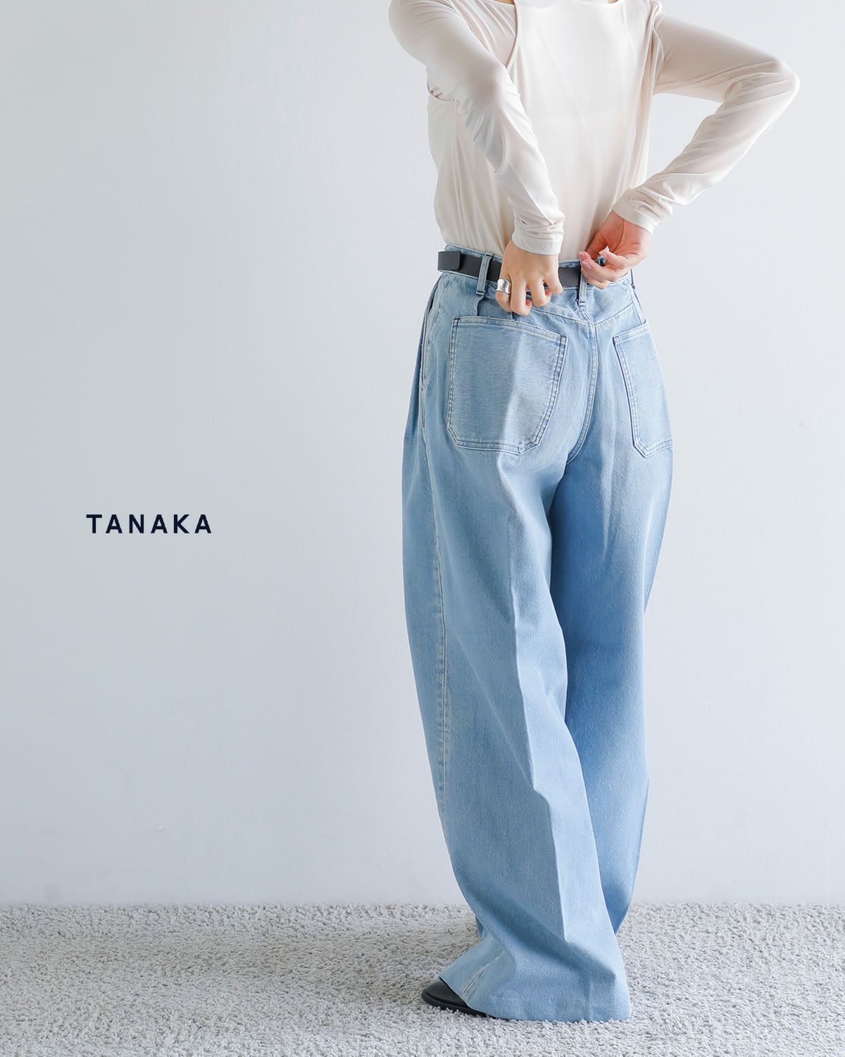 上品なフォルムに対照的な程よいダメージ感と細めのベルトループなどTANAKAらしい細部にまで拘った個性的なデザインながらオーセンティックなデニム素材で長く愛用いただける商品です。余計な装飾を省いたミニマルな仕様で、合わせるトップスやシューズを選ばず、幅広いスタイルに溶け込む一本をぜひご覧ください。
