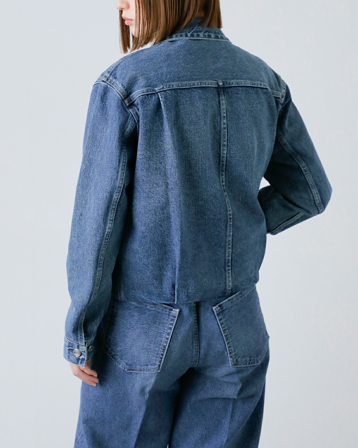 さらに、岡山の熟練職人によって一枚一枚丁寧に仕上げられた 美しいブルーのデニム は、まるで何年も着込んだかのような自然な色褪せを表現。リベットやアクションプリーツなどのディテールにもこだわり、時代を超えて愛される一着に仕上げました。