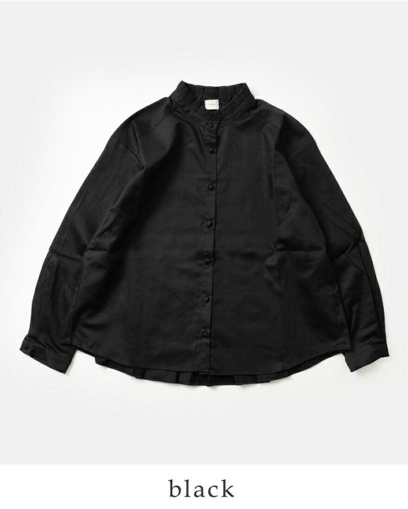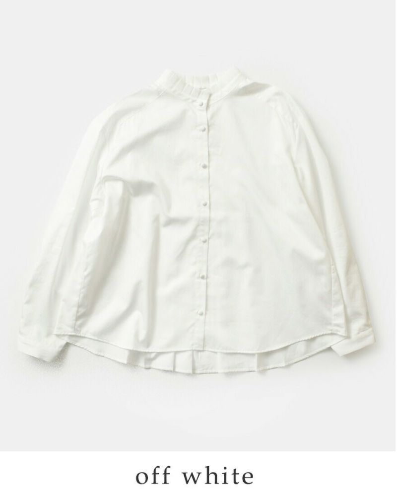 tumugu(ツムグ)より、コットンサテンスタンドカラーブラウスのご紹介です。首元は細かなプリーツを施して、クラシカルで華やかな印象。背中にもタックを施すことで、立体感のあるシルエットでキレイめな印象に。ふんわりと軽く、光沢のあるコットンサテン生地はやや光沢があり、品のある印象。デイリーにはもちろん、オケージョンスタイルにもお使いいただけます。