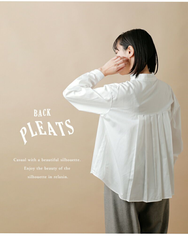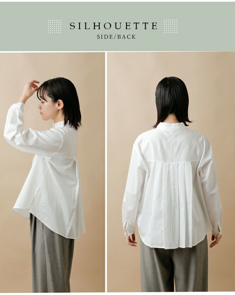 このブラウスの魅力は、なんといっても背中に施したプリーツ。肩のヨークの下から伸びるプリーツは、ふんわりとした立体的なシルエットを演出します。後ろ姿の美しさで印象づける、抜かりのないデザインです。
