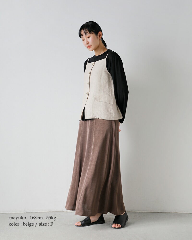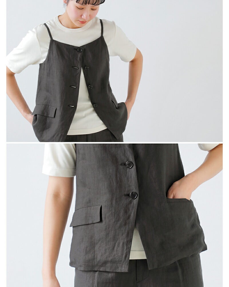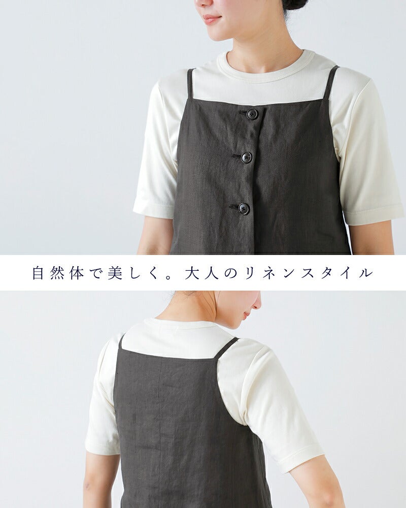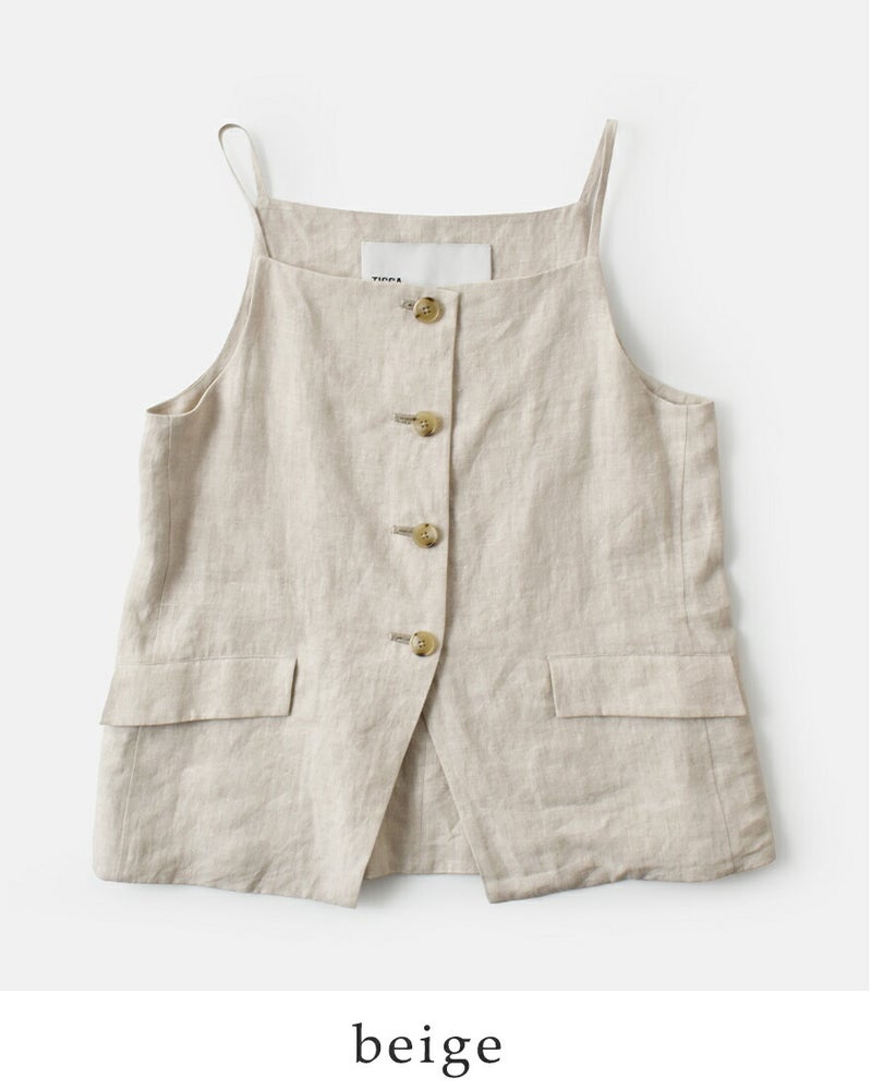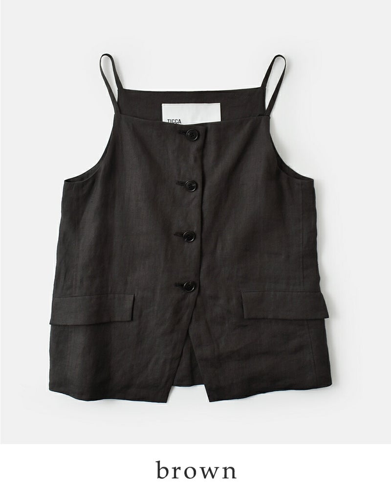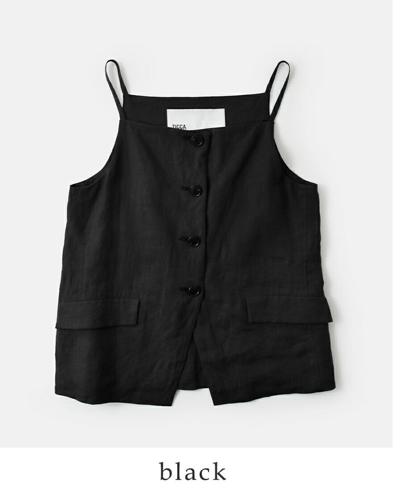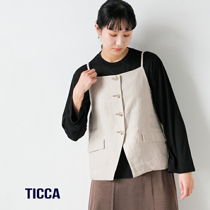 TICCA(ティッカ)よりリネン キャミソール ベストのご紹介です。上質なリネン素材を使用した、軽やかで洗練された印象のキャミソール型ベスト。ナチュラルな風合いと程よいハリ感があり、シンプルながらも存在感のある一枚に仕上がっています。フロントにはボタンディテールを施し、縦のラインを強調することで、すっきりとした印象を演出。やや短めの着丈がスタイリングに軽快さを加え、レイヤードスタイルのバランスも取りやすくなっています。インナー次第で季節を問わず活躍し、Tシャツやカットソー、ワンピースの上に重ねるだけで、コーディネートに奥行きをプラス。同素材のパンツと合わせたセットアップの着こなしもおすすめで、ナチュラルながらも大人らしいスタイリングが完成します。