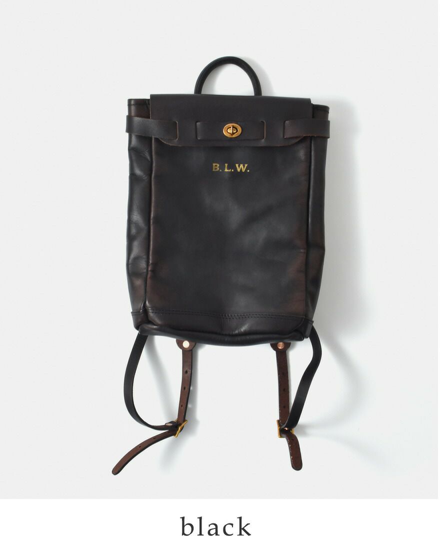 「荷物を入れて放浪したくなる」を意味する「Baggage」「Lood」「Wonderlust」の頭文字をとった「B.L.W」が刻印されています。ヴィンテージ感のある真鍮ヒネリもアクセントになっています。