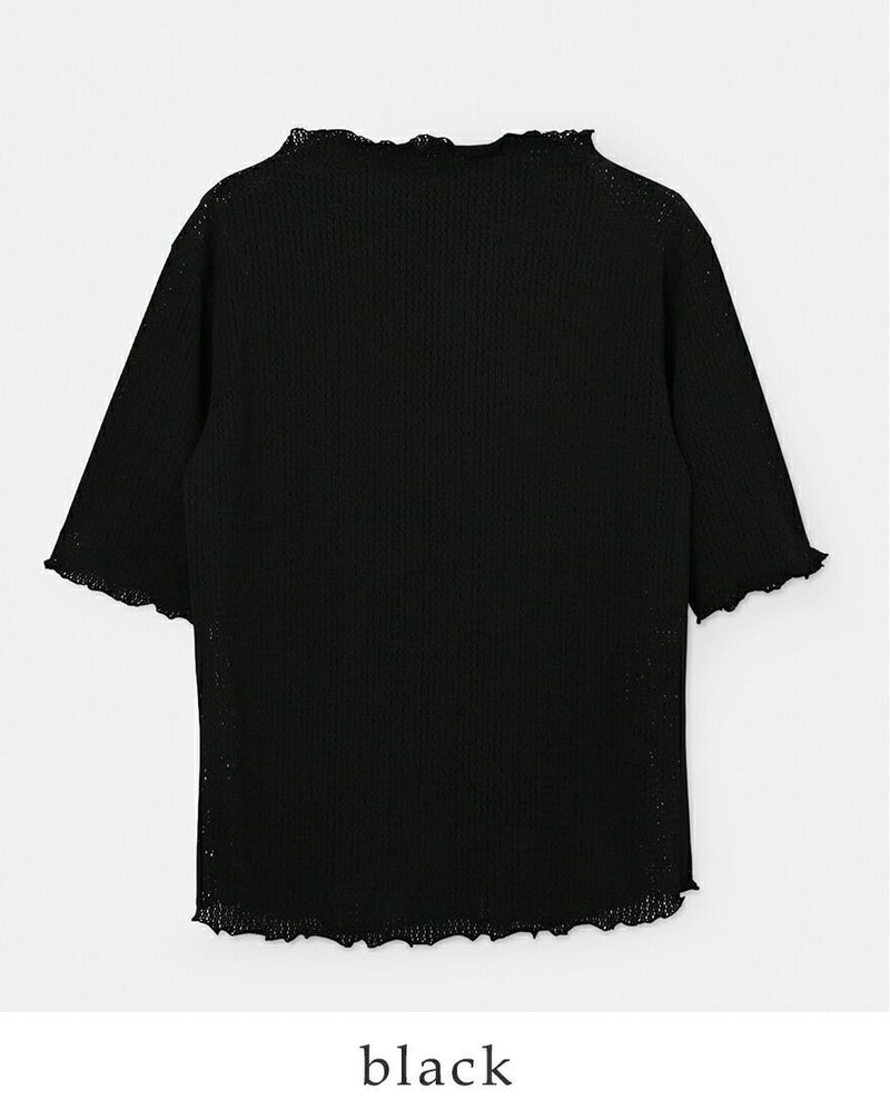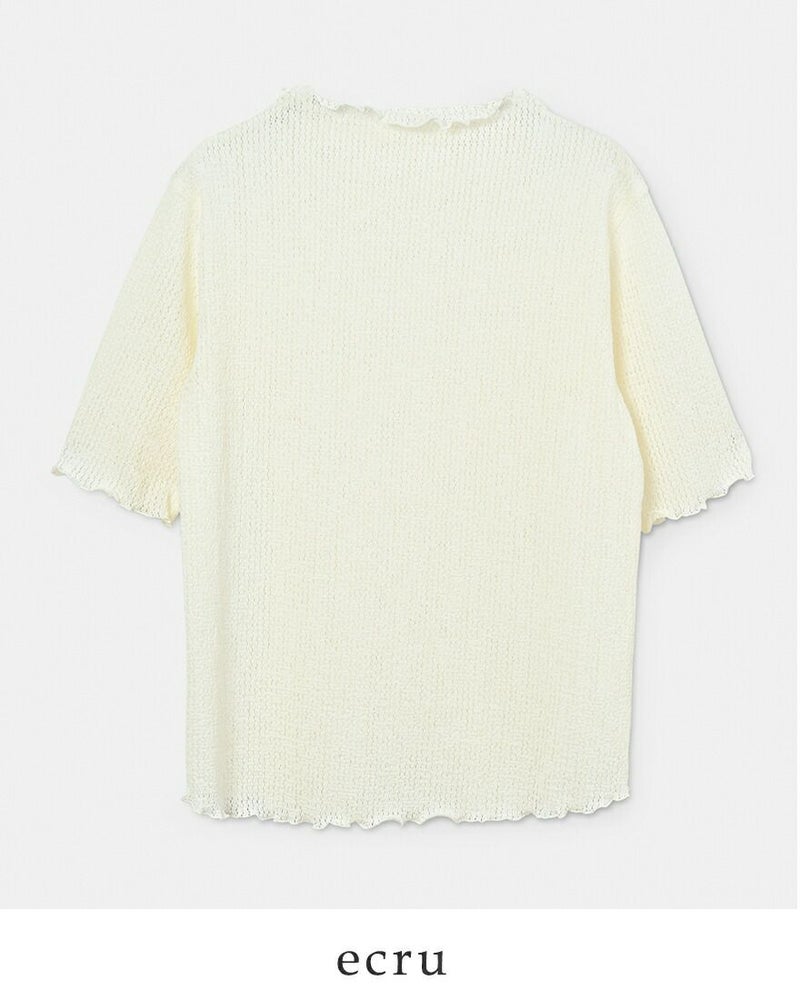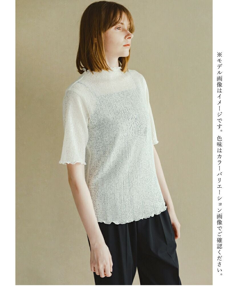 whyto(ホワイト)よりメロウモックネック シアー レース ブラウス “sheer lace blouse”のご紹介です。繊細な凹凸感が美しいシアーレースブラウス。 テープ状のレースを甘めに織り編むことで、ニットのような温かみと上品さを表現。透けすぎない絶妙なシアー感が、いつもの装いに奥行きとセンシュアルな魅力をプラスします。身頃から自然に立ち上げたモックネックが、首元を優しく、そしてスマートに演出。 ネックラインや袖口、裾にはメロウ加工を施し、ひらひらとした波打つような動きが女性らしさを引き立てます。